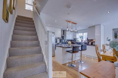KITCHEN/DINER 18' 10" x 16' 3" (5.74m x 4.95m) Big kitchen with island in the middle very modern and loads of space for a dining table, the stairs to go upstairs are also in the kitchen. Plus a door to go onto the back garden.
