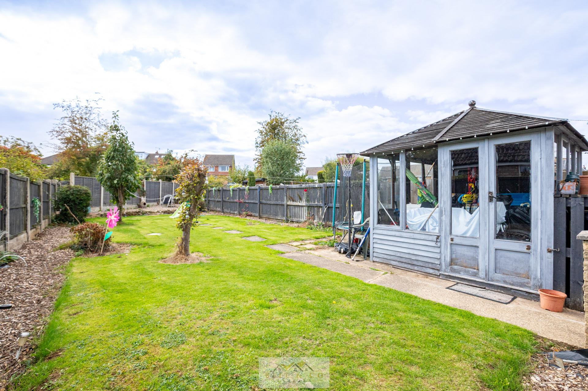 A private garden featuring a patio seating area, lawn, and a summer house-ideal for entertaining, relaxing, or use as a hobby space.