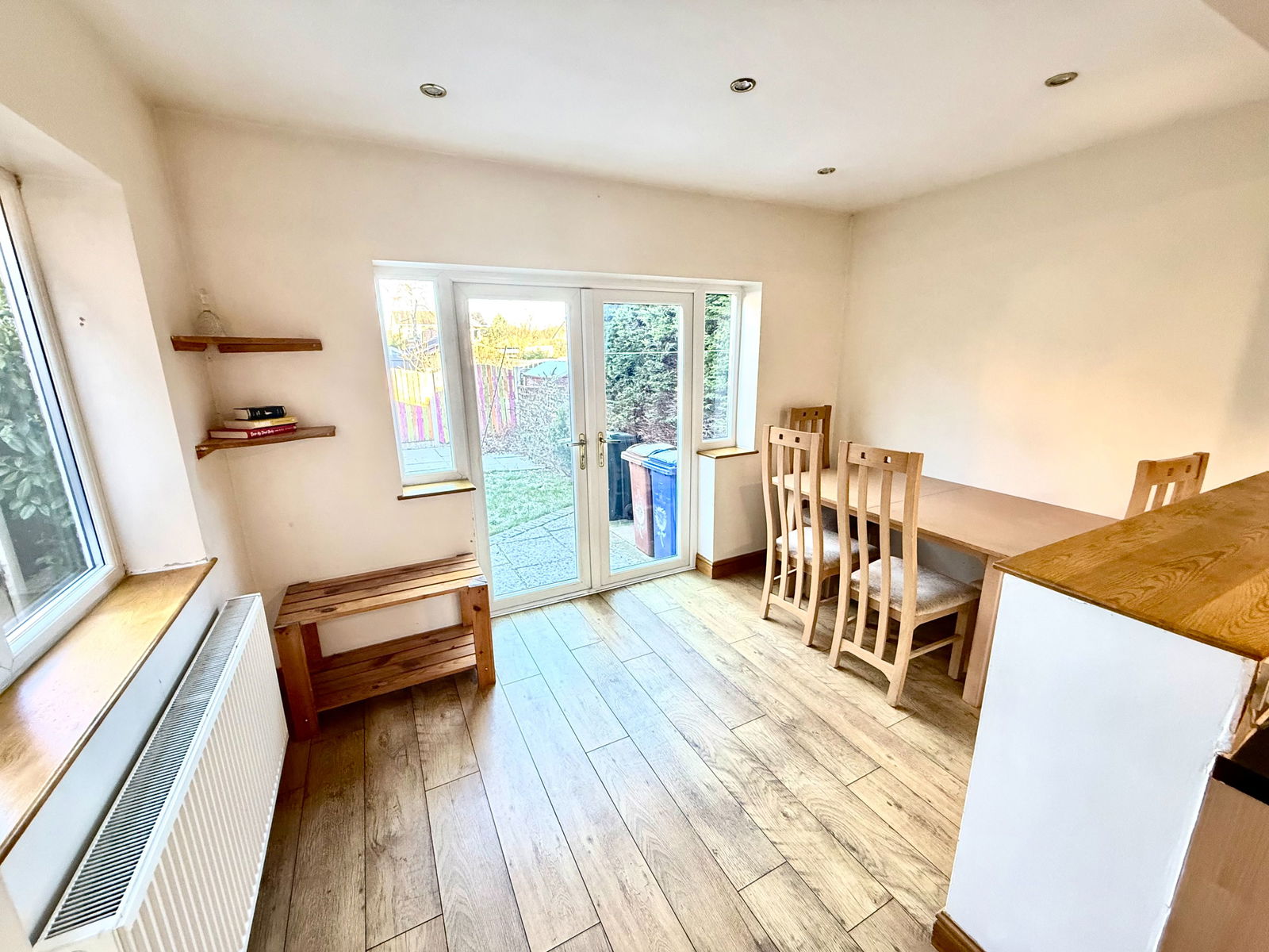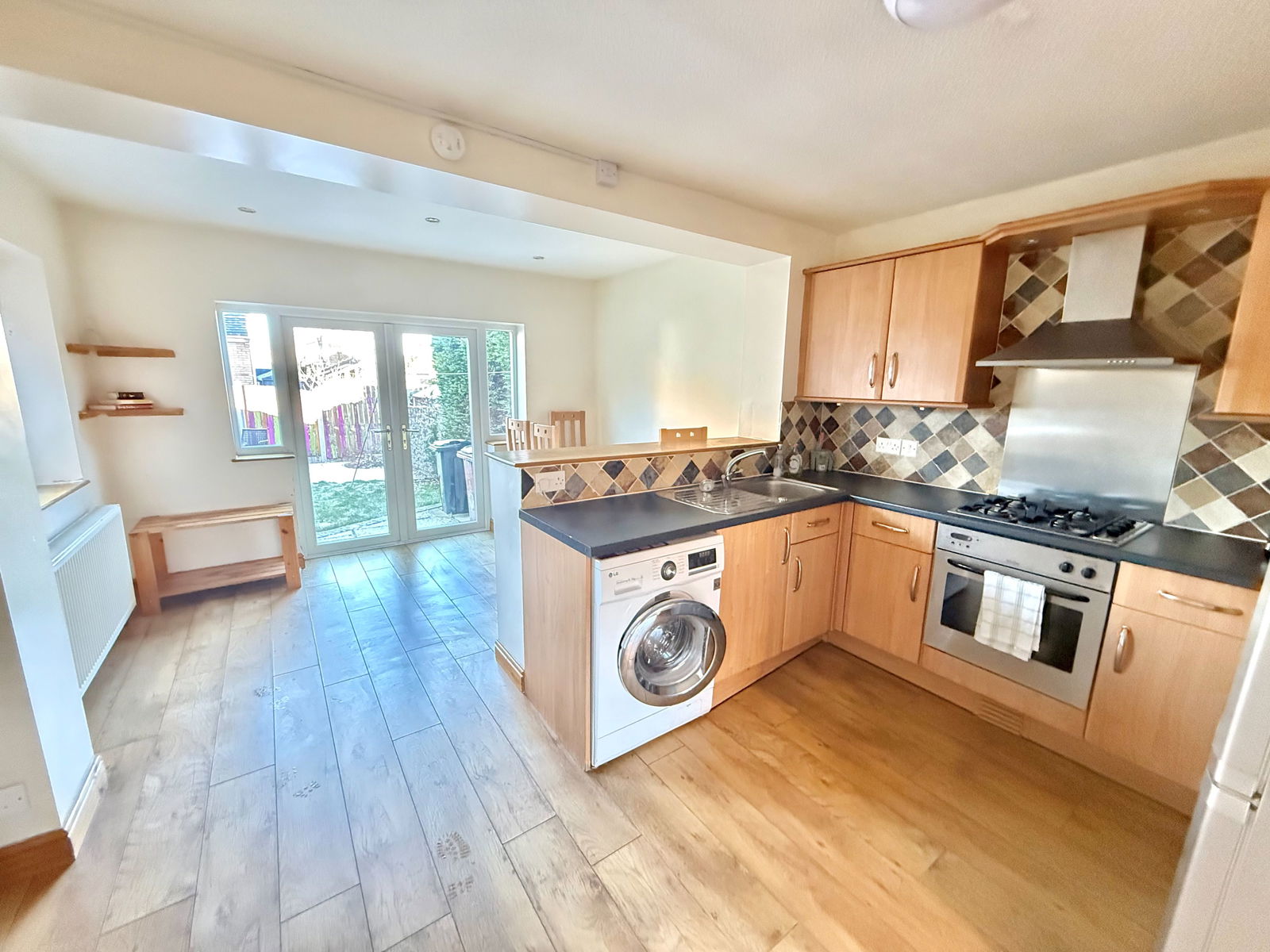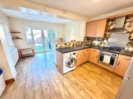The living kitchen offers exceptionally well proportioned accommodation resulting from a double story extension; the kitchen area presents a comprehensive range of furniture with a work surface incorporating a stainless steel sink unit whilst having partial tilling to the walls and a complement of appliances, including an integral oven with a four ring hob that has a stainless steel splash back and extractor fan over, has plumbing for an automatic washing machine, space for the fridge freezer. Open plan access to the dining area which has windows to two aspects and French doors opening directly onto the rear garden.
