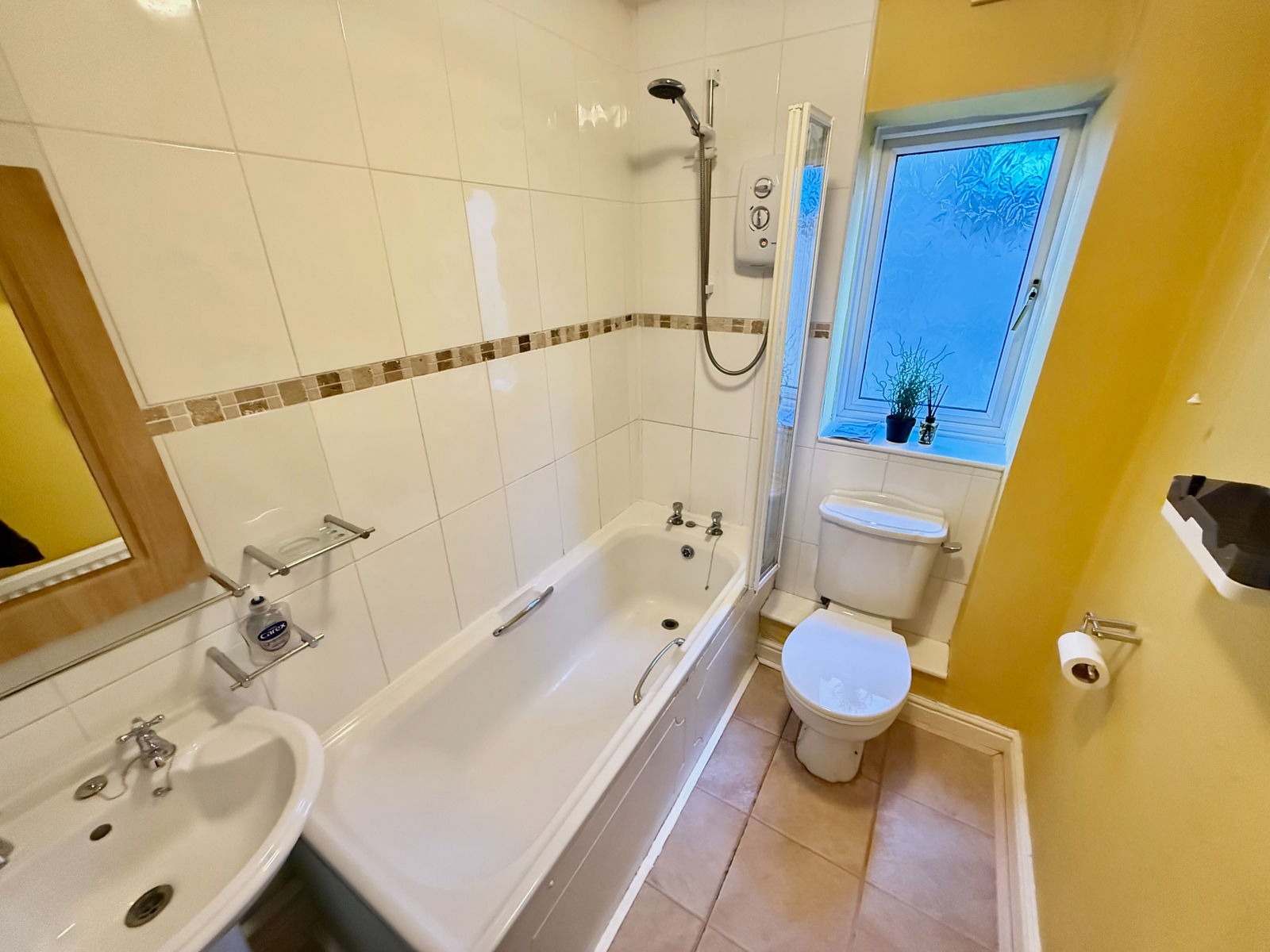 The bathroom is presented with a three-piece suite finished in white comprising a panel bath with shower over, a pedestal wash hand basin and a low flush W.C; the room having partial tiling to the walls, full tiling to the floor and opaque window.