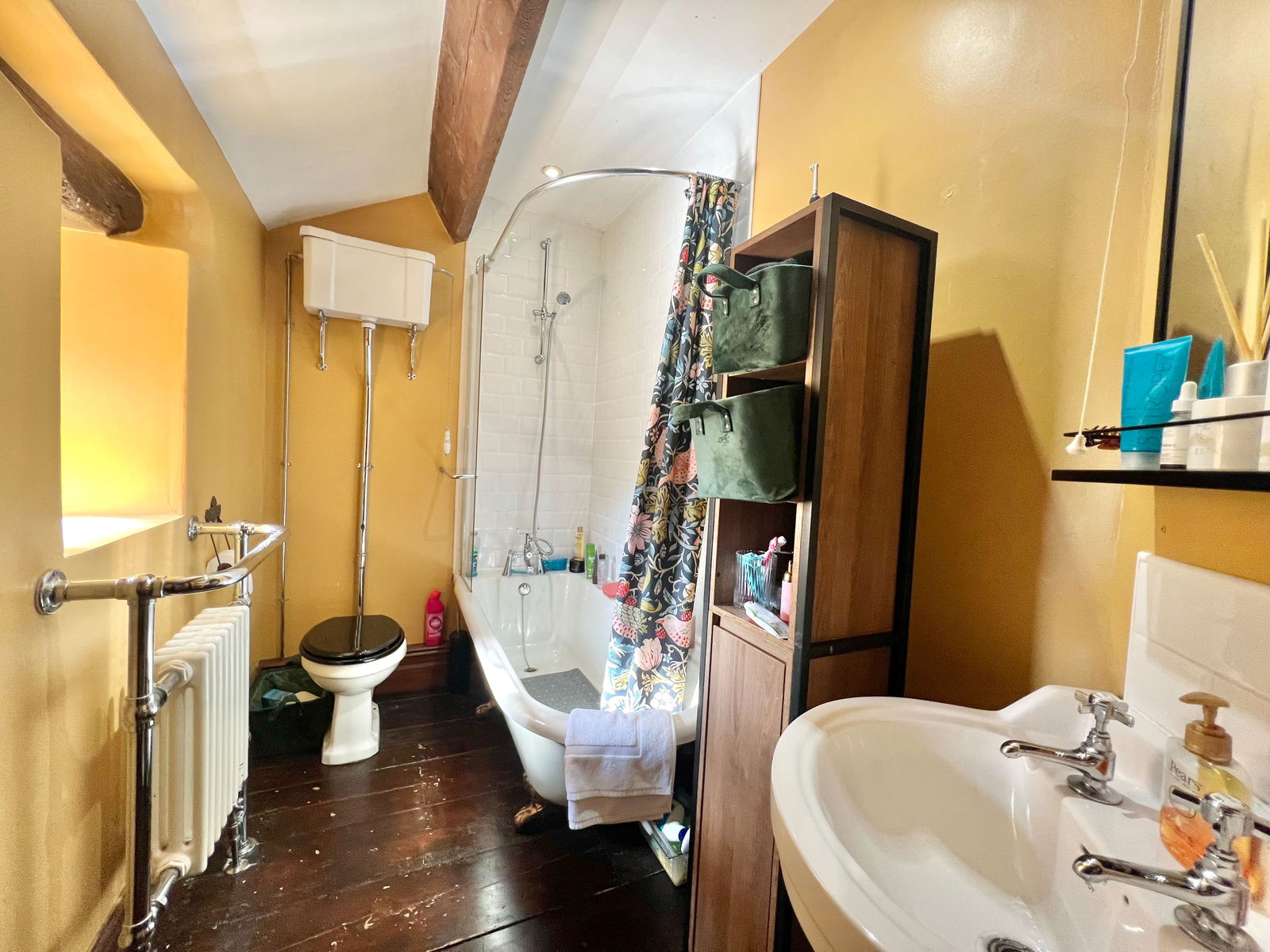 The family bathroom features a unique three-piece suite comprising a bath, toilet, and washbasin. There's partial wall tiling, exposed ceiling beams, spotlighting, and a rear-facing obscure-glass double-glazed window, along with a central heating radiator.
