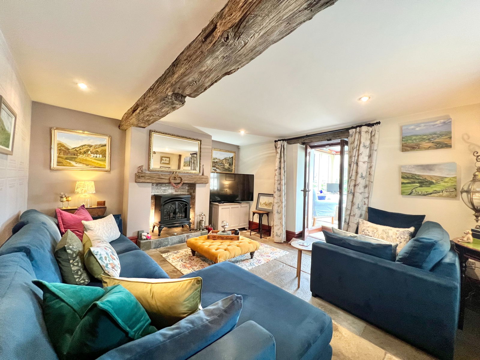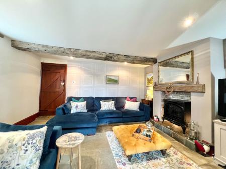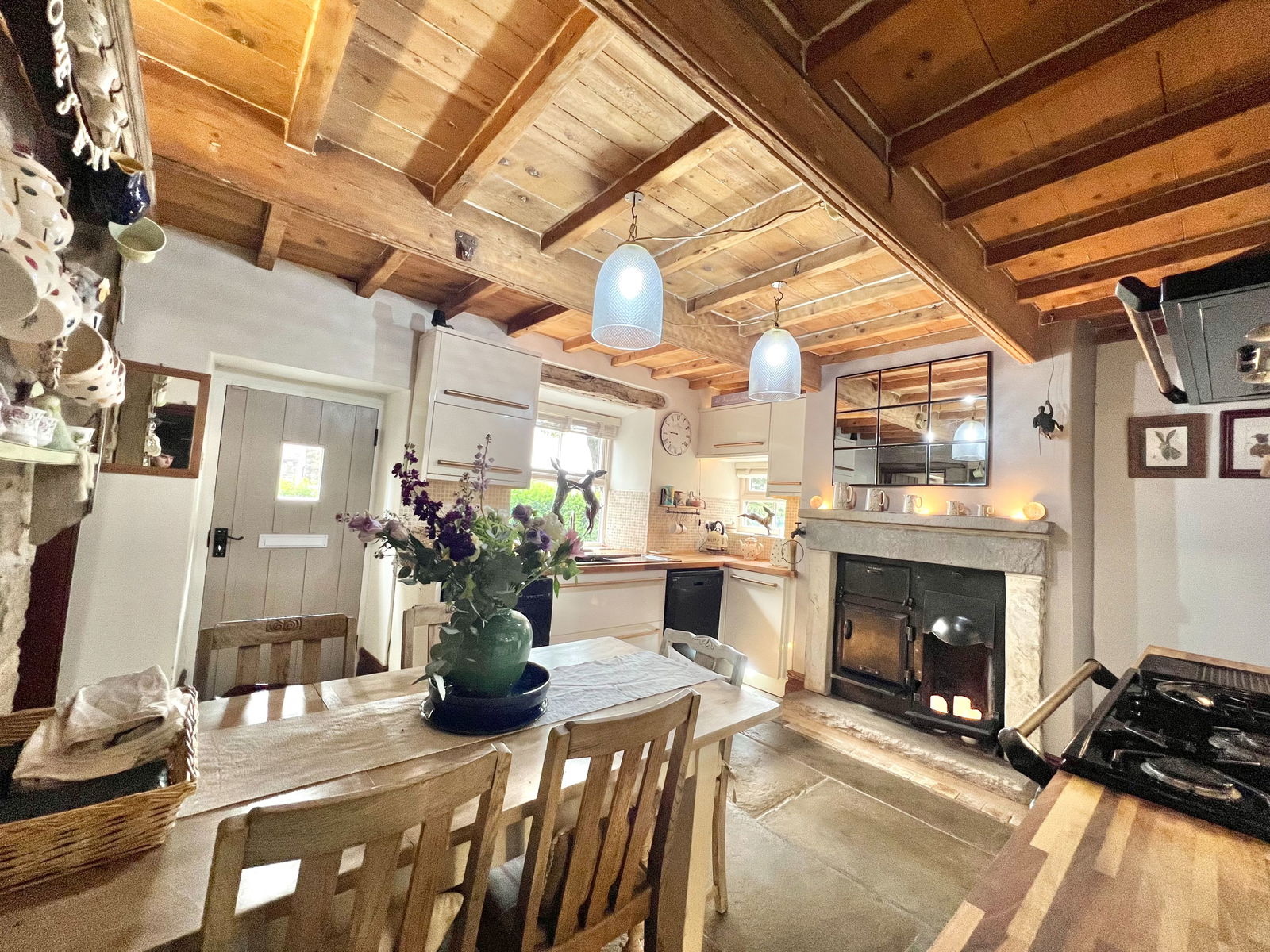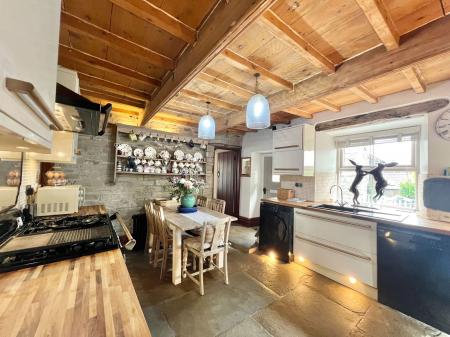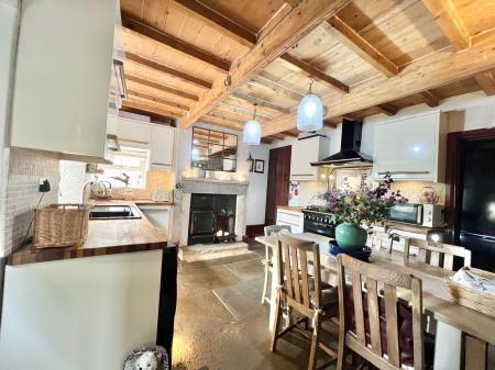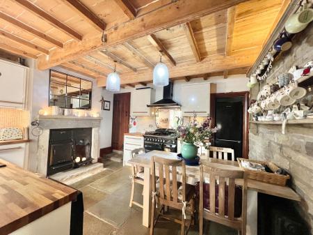A standout feature is the Rangemaster cooker with a 5-ring gas hob and electric oven, perfect for family meals or entertaining. Additional highlights include partially tiled walls, exposed beams, and a striking exposed brick feature wall. There's also access to a cellar, offering versatile storage or appliance space – ideal for a fridge freezer, washing machine, or dishwasher. A charming inglenook fireplace with stone hearth and surround adds a cosy touch.