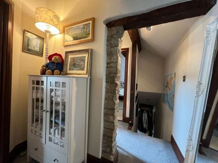 A characterful landing with a stunning exposed stone feature wall and exposed beams provides access to three bedrooms and the family bathroom.