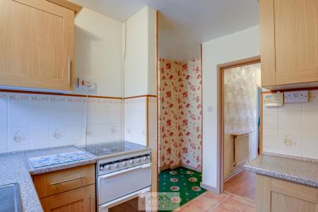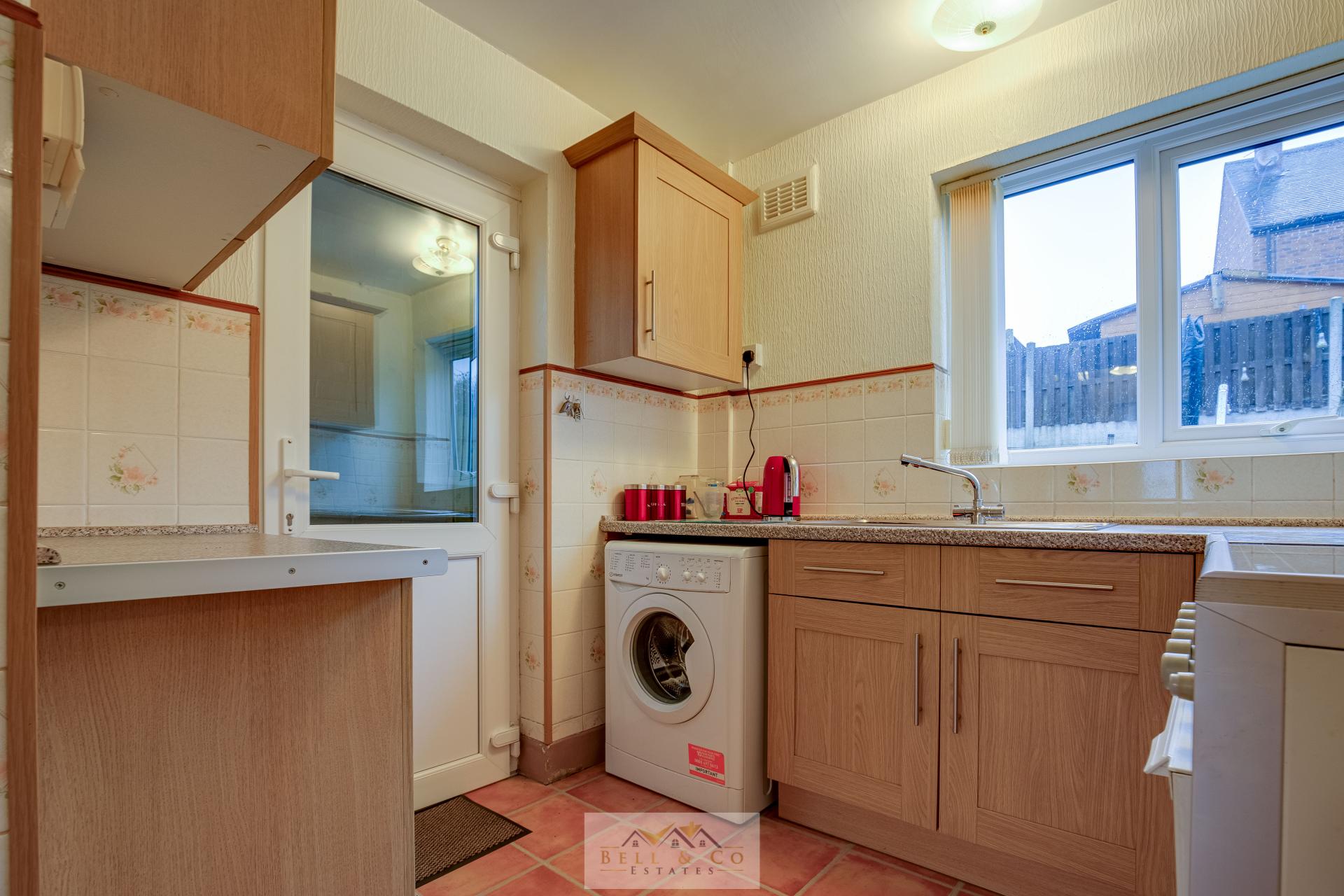 Fully fitted kitchen, with rear door access into outdoor store areas, with further access into the garden, providing plenty of worktop and cupboard space with pantry under the stairs.