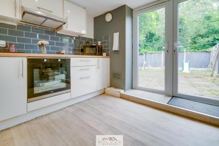 KITCHEN 8' 10" x 8' 9" (2.69m x 2.67m) Modern kitchen with integrated appliances and sliding doors giving access to the rear garden.