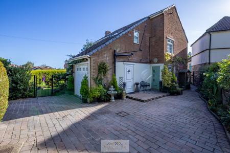 Externally, the property is just as impressive. To the front, a gated driveway provides secure off-road parking and access into the garage, which is currently divided into two sections and perfect for storage or hobby space.
