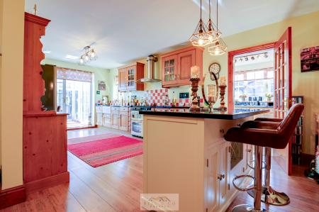 KITCHEN 11' 0" x 8' 2" (3.35m x 2.49m) A separate fully fitted kitchen offers an abundance of cupboard and worktop space, complete with integrated appliances and another large range cooker also a rear door leading into a second conservatory again. There is wooden flooring and a breakfast bar with space for chairs to have some breakfast or lunch.