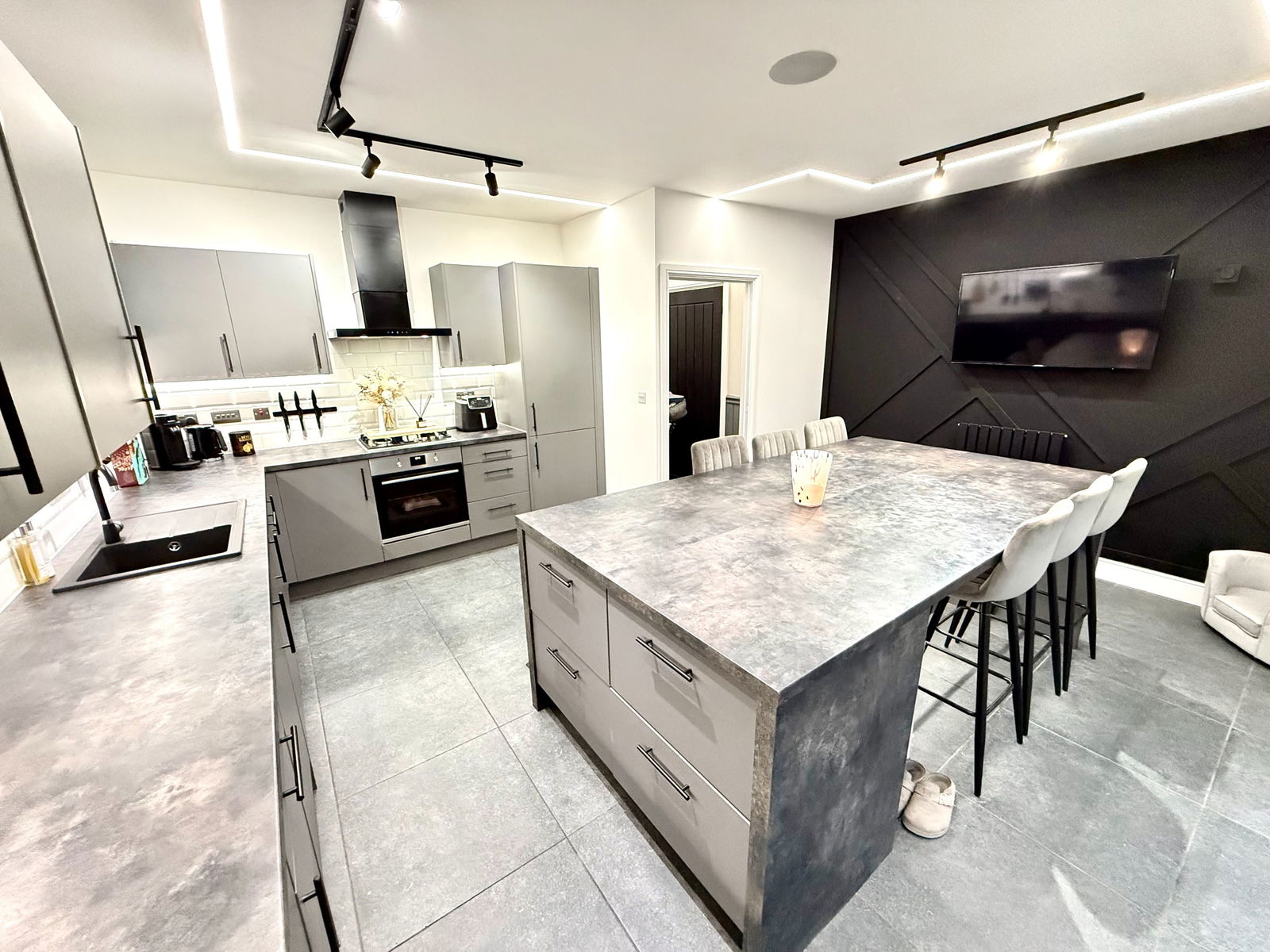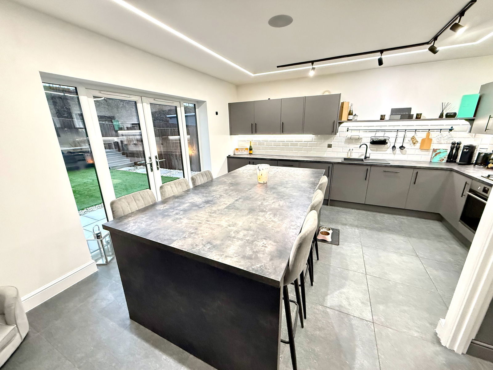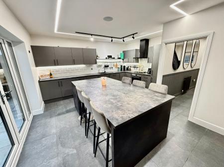 The living kitchen forms the hub of the home; a spacious room with full height windows and French doors opening directly onto the garden, seamlessly connecting the inside to the outdoors. This room has tiling to the floor, wood panelling to one wall and LED strip lighting to the ceiling. Presented with a comprehensive range of fitted kitchen furniture with work surfaces incorporate a sink unit with splashback tile to the walls and concealed LED lighting. A central island comfortably seats six, offering a sociable entertaining space whilst a full complement of appliances includes an integral oven with a four ring gas hob over and extractor hood, a fridge freezer, dishwasher, wine chiller and an automatic washing machine.