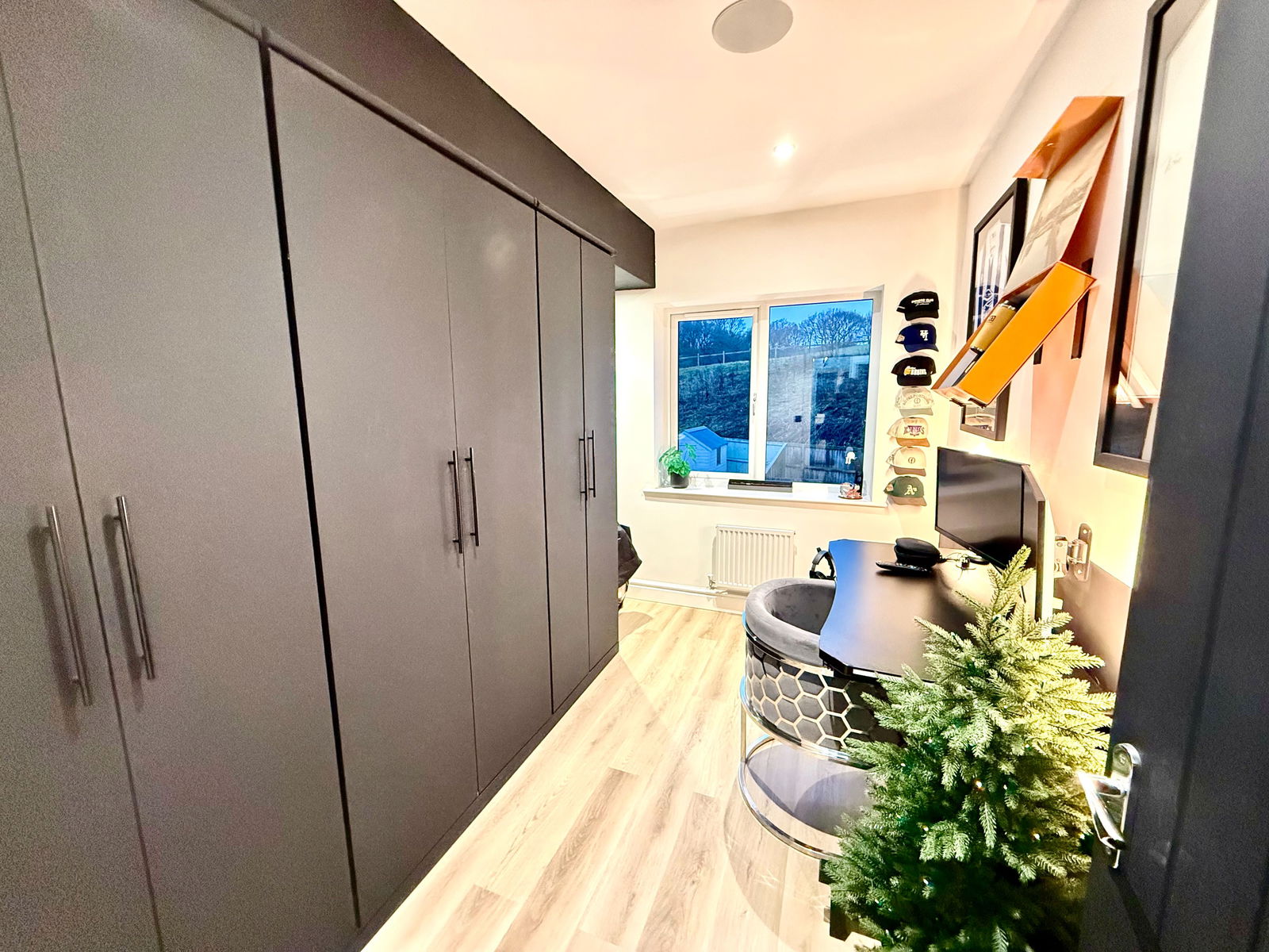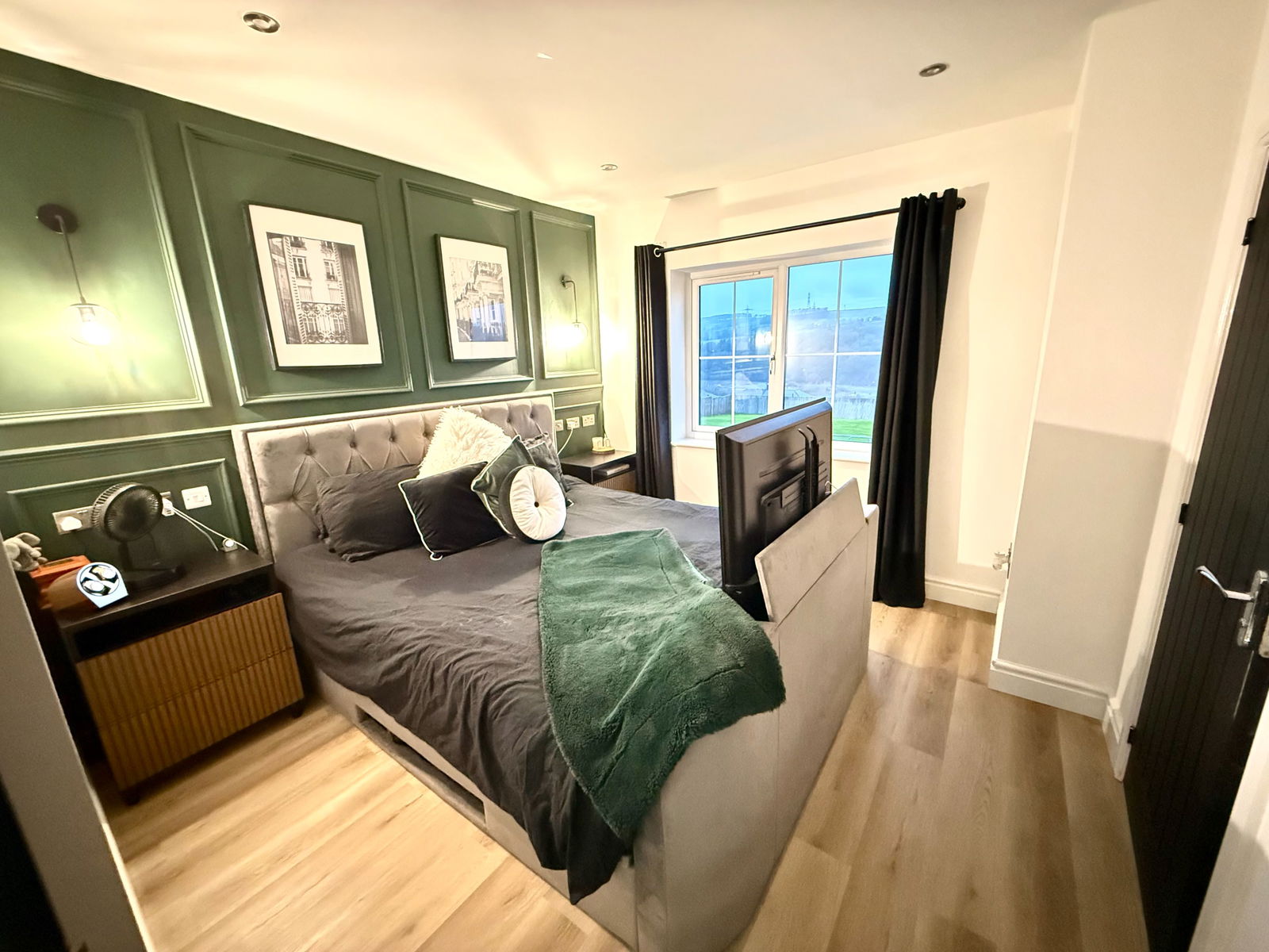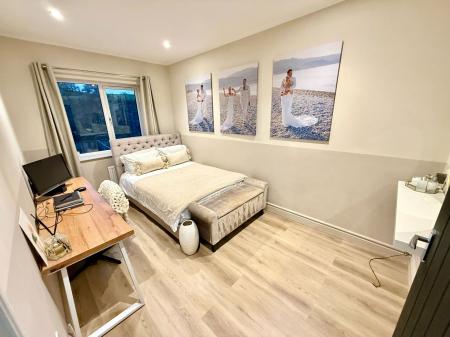 The principal bedroom suite is positioned to the front aspect of the home, a stunning room offering double accommodation with feature wood panelling to one wall and a window commanding stunning cross valley views. The room has fitted wardrobes and an en-suite shower room that is presented with a modern three-piece suite.