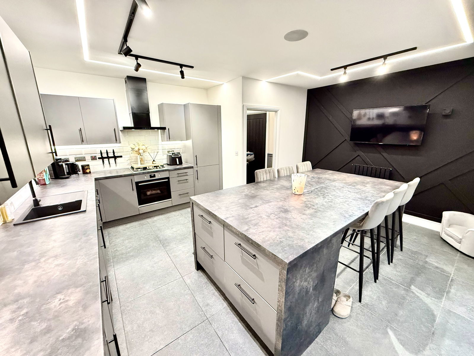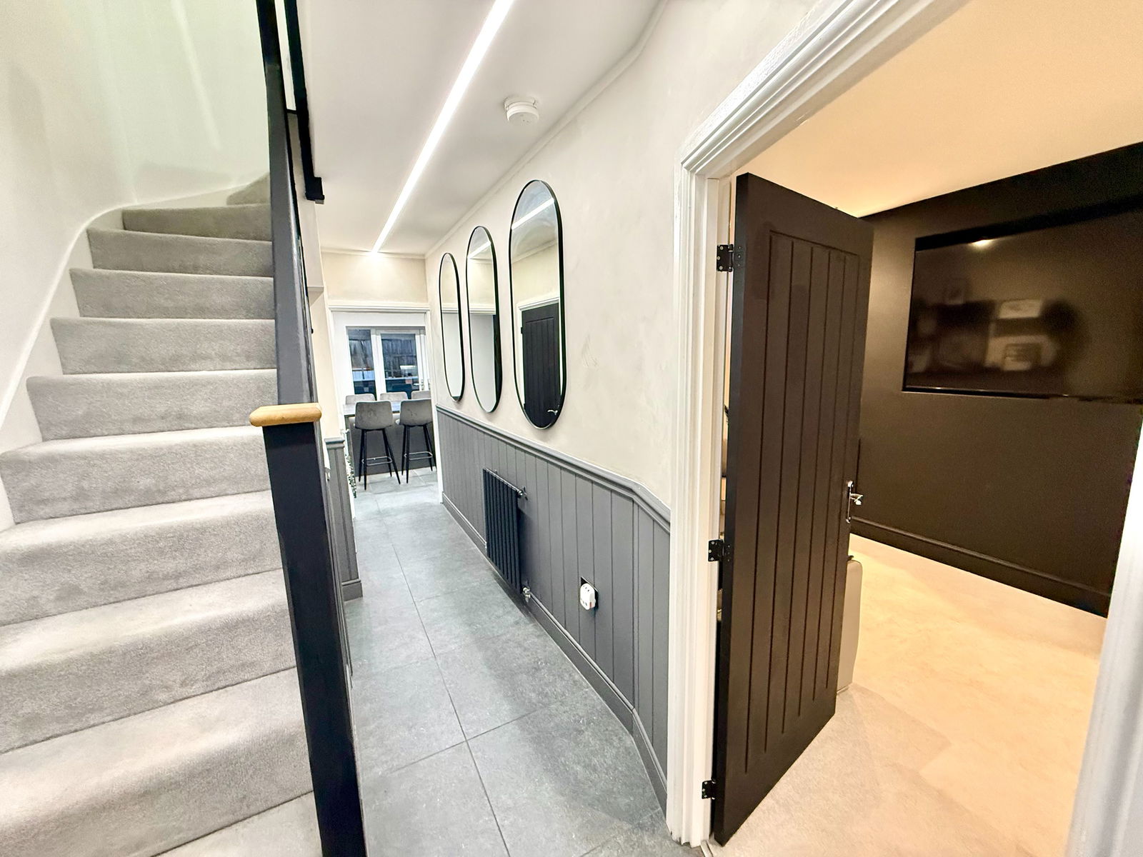 A composite entrance door opens to a spacious reception hall which offers an impressive introduction to the home, presenting a glimpse through the kitchen to the garden at the rear. The hallway has tiling to the floor, feature panelling to the walls, a staircase to first floor level with storage beneath and feature LED strip ceiling lighting. A cloakroom is presented with a modern two-piece suite.
