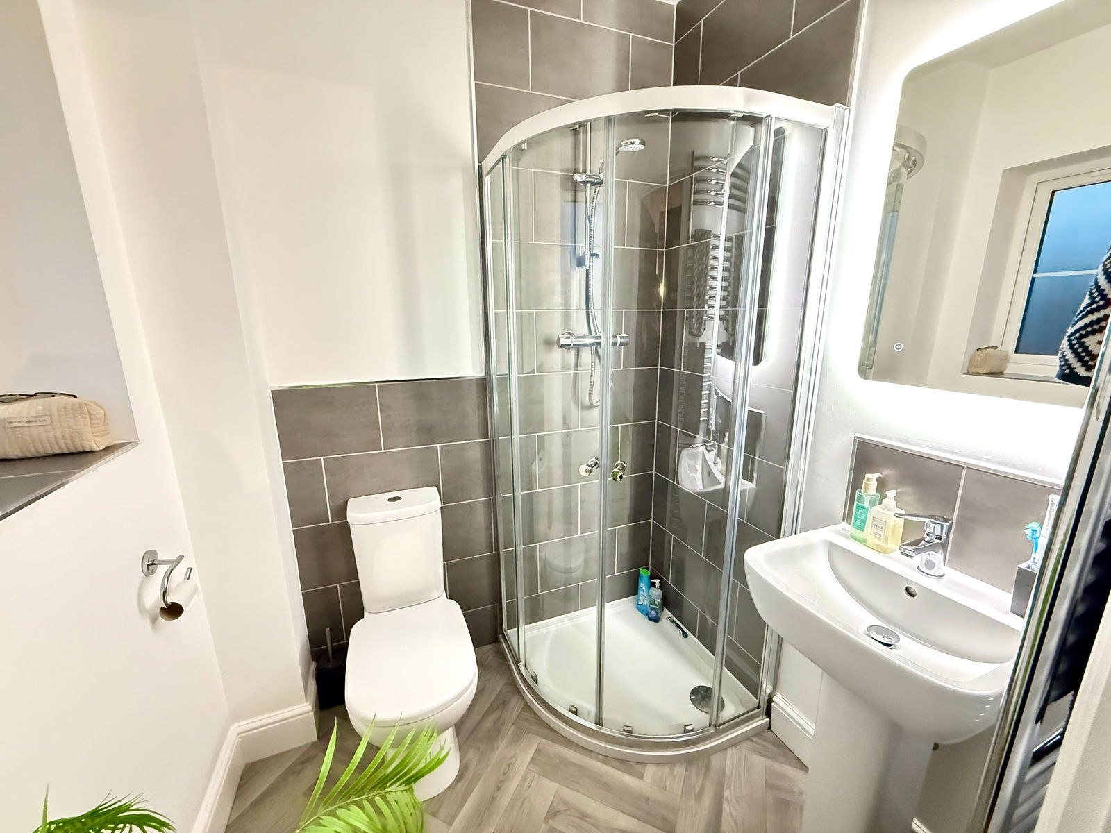 The family bathroom is presented with a modern suite finished in white complimented by feature tiling to the walls.