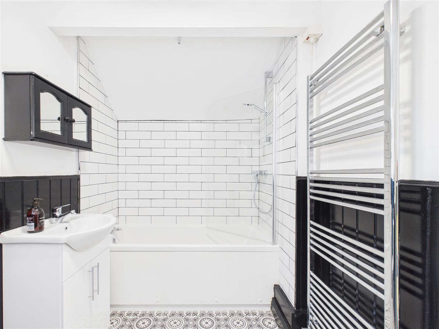 2.69 x 1.89 (8'9" x 6'2") - There's something about a brand-new, un-used bathroom... you can't beat it, especially in a crisp, monochrome design. Located downstairs means that absolutely no upstair space is compromised at all, yet the bathroom remains a great size. The white bath has a overhead electric shower with instant hot water & white brick tiling with dark grey grouting. The pedestal sink & toilet are also in white.