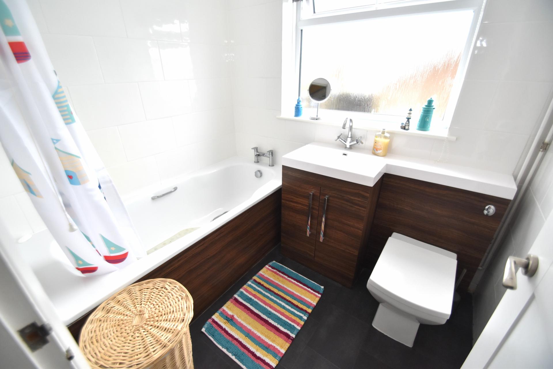 Family Bathroom 7' 1" x 5' 10" (2.16m x 1.78m) Attractively fitted with a white contemporary suite comprising of panel bath with mixer tap and pop-up waste together with Myra independent shower over rail and curtain, vanity hand basin with mixer tap and cupboard under, low level WC with concealed cistern, chrome heated towel radiator, fully tiled walls, vinyl flooring.