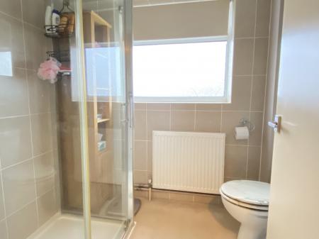 Shower Room 6' 10" x 5' 6" (2.08m x 1.68m) Fitted with a modern tiled shower cubicle with sliding door and glass panel mixer shower over, low-level WC, pedestal basin with taps, radiator, Light and shaver point, wall-mounted fan heater, part tiled walls, uPVC double-glazed window to rear aspect with obscure glass.
