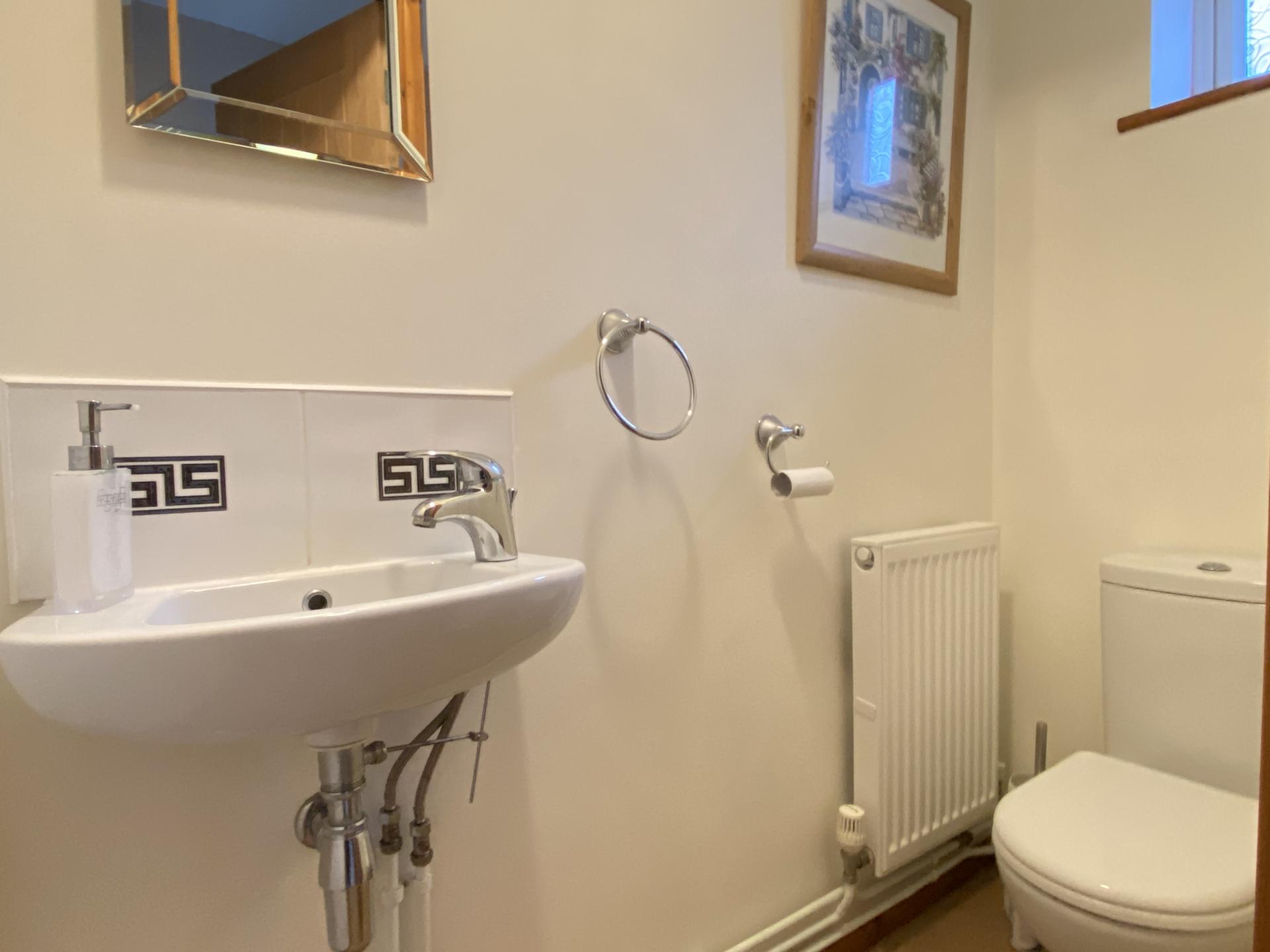 Cloakroom Fitted with a low-level WC, wall-mounted wash basin with mixer tap and tiled splashback, radiator, front aspect uPVC double glazed window with obscure glass.