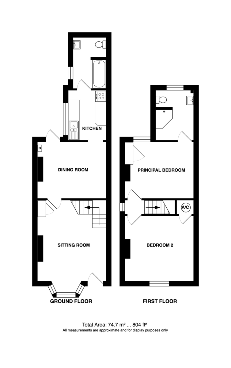 The front door opens into a welcoming sitting room, featuring a west-facing bay window that fills the space with natural light, and stairs rising to the first floor. A door leads through to the dining room, which provides access to the rear garden and a well-fitted kitchen. Beyond the kitchen is a ground floor bathroom.