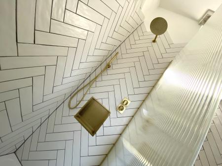 Shower Room 6' 11" x 5' 4" (2.11m x 1.63m) New white 3 piece suite comprising vanity basin, low level wc and large shower cubicle with half-screen, brass coloured mixer, overhead rose, shower wand and wall niche, herringbone tiled splashbacks, electric fan heater.
