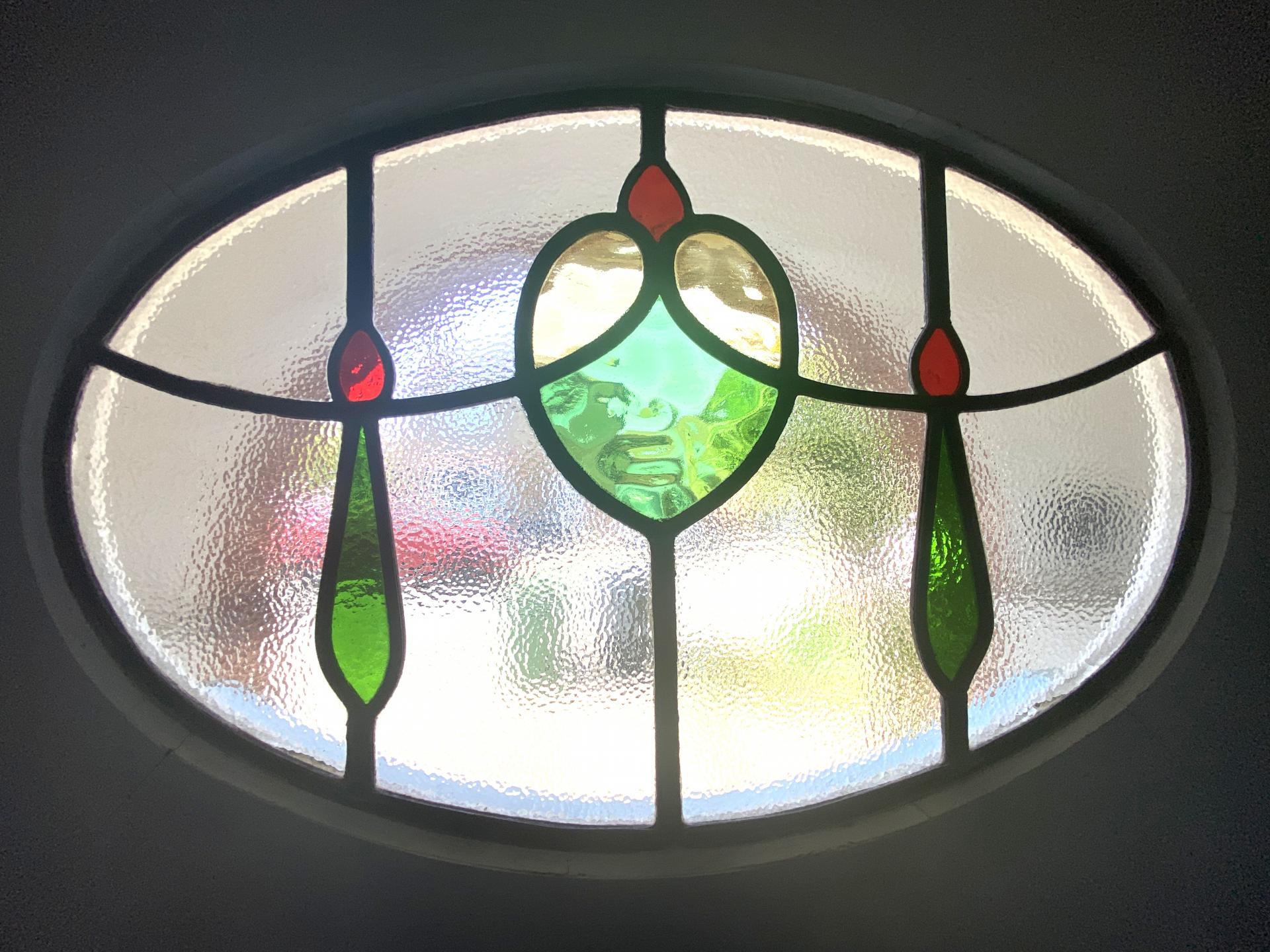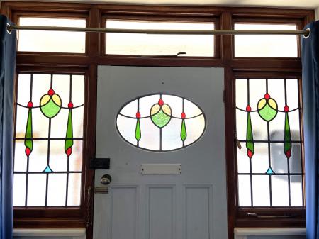 Entrance Porch Original entrance door with stained glass oval window and matching stained glass side windows to: