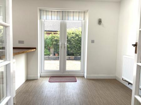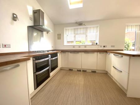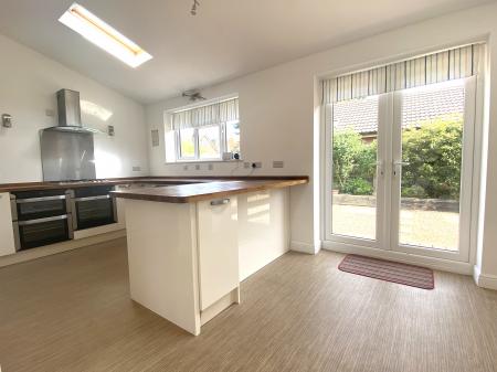 Kitchen/Breakfast/Family Room 19' 2" x 8' 9" (0m x 2.67m) Plus 10' x 6'9" (Side & Rear Aspect) A generous L-shaped room attractively fitted and comprising single drainer sink with mixer tap, space & plumbing for a dishwasher and washing machine, built in cupboard housing the gas boiler providing central heating and domestic hot water, shelved pantry with double doors, integrated dishwasher, fridge & freezer, range of base cupbosrd units with pan drawers and hardwood work surfaces over, Belling double oven and further single oven, Belling gas hob and canopy extractor over with brushed stainless steel splashback, uPVC French doors to garden, two Velux roof lights, high level power point and aerial point for a wall mounted television, two double radiators, built-in cupboard with shelves and uPVC double glazed window to side, 4 wall light points, vinyl flooring.