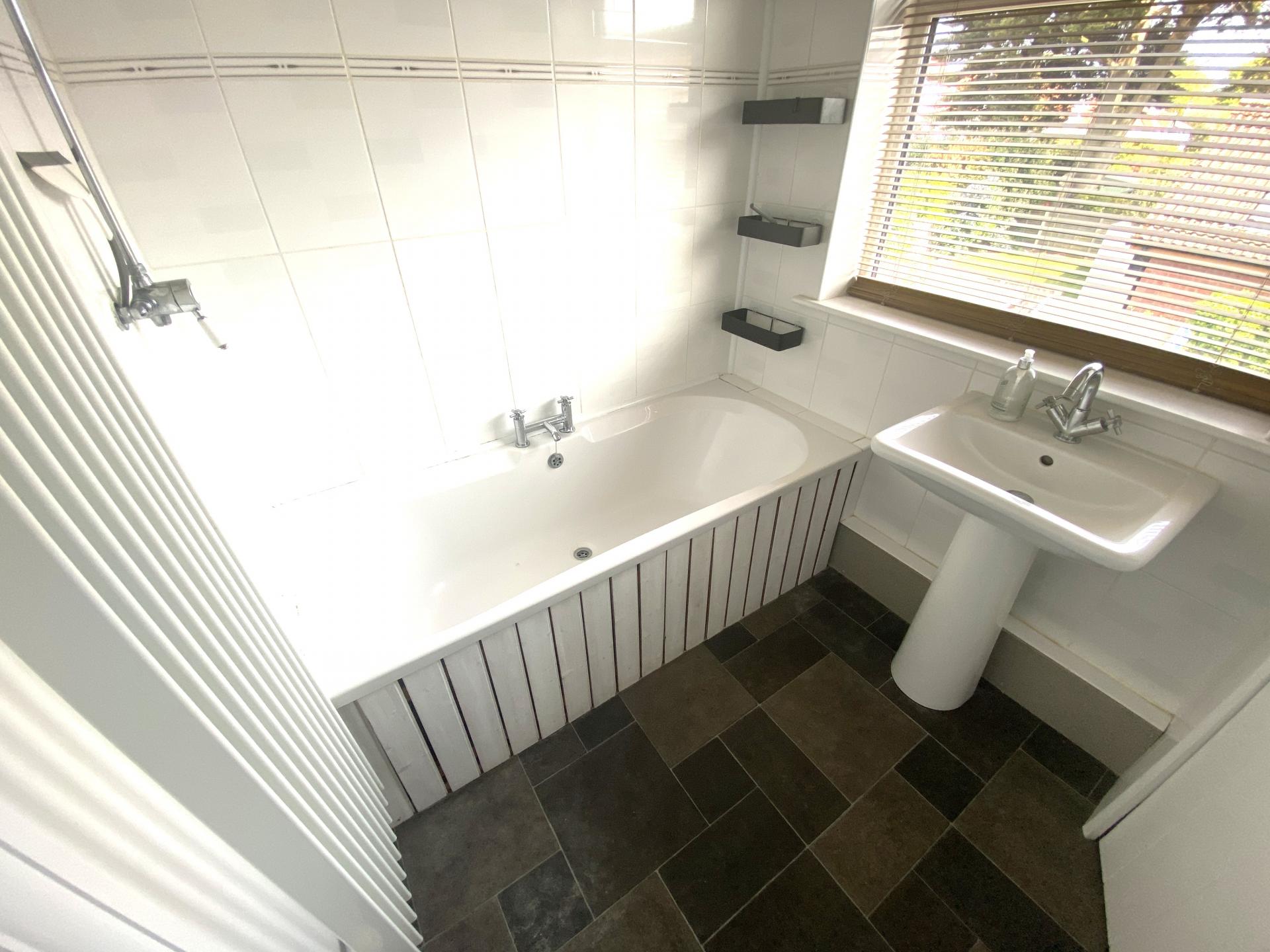 Bathroom 6' 7" x 5' 9" (2.01m x 1.75m) (Rear Aspect) Fitted with white suite comprising panelled bath with mixer tap and independent shower over, rail & curtain, pedestal hand basin with mixer tap, part tiled walls, contemporary radiator, built-in linen cupboard with slatted shelves and radiator.