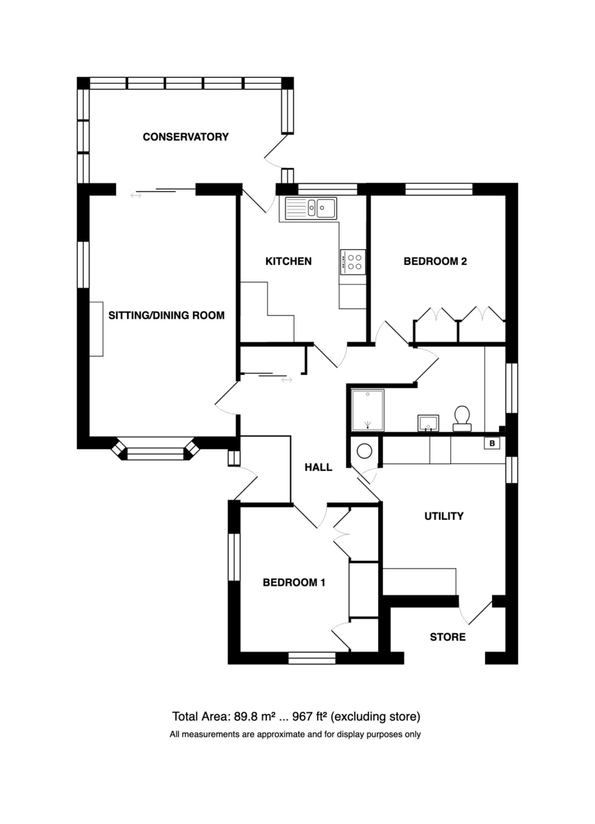 The accommodation would benefit from some updating and currently comprises an entrance porch leading into a reception hall, a light and airy sitting room with sliding patio doors opening into the conservatory, a fitted kitchen, two double bedrooms both with fitted wardrobes, and a shower room. The former garage is now utilised as a utility room and store, with the original garage door still in place, making it straightforward to revert to a garage if required.