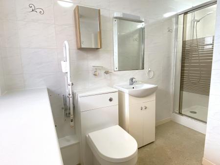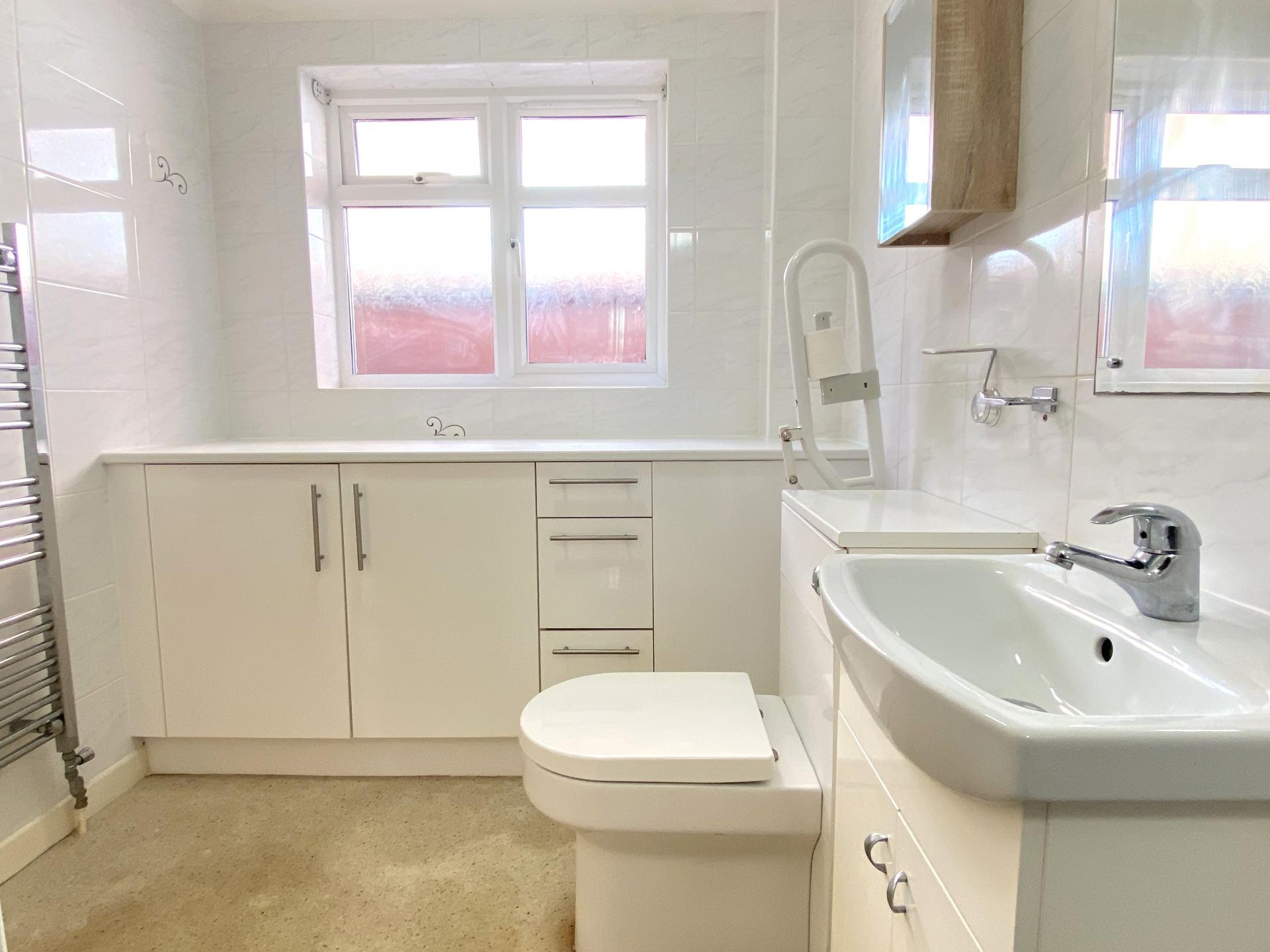Shower Room 11' 8" reducing to 6'7" x 6' 5" (3.56m x 1.96m) Fitted with a white vanity basin with mixer tap and unit beneath, low-level WC with concealed cistern, tiled shower cubicle with mixer shower and pivot door, range of base units with working surfaces over, mirror light and shaver point, medicine cabinet, uPVC double-glazed window to side aspect with obscure glass, heated towel rail, fully tiled walls.