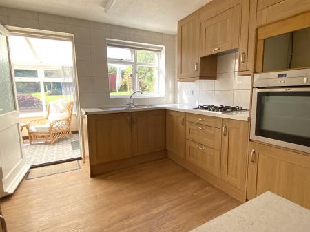 Kitchen 11' 0" x 9' 5" (3.35m x 2.87m) Fitted with a range of wood effect, shaker-style base units with working surfaces over, matching wall units, two glass display cabinets, eye level NEFF single oven, housing for an integrated microwave, gas hob with integrated extractor over, space for a fridge freezer, one and a half bowl sink with mixer tap, uPVC double-glazed window to rear aspect offering views over the beautiful south-facing garden, radiator, fully tiled walls.