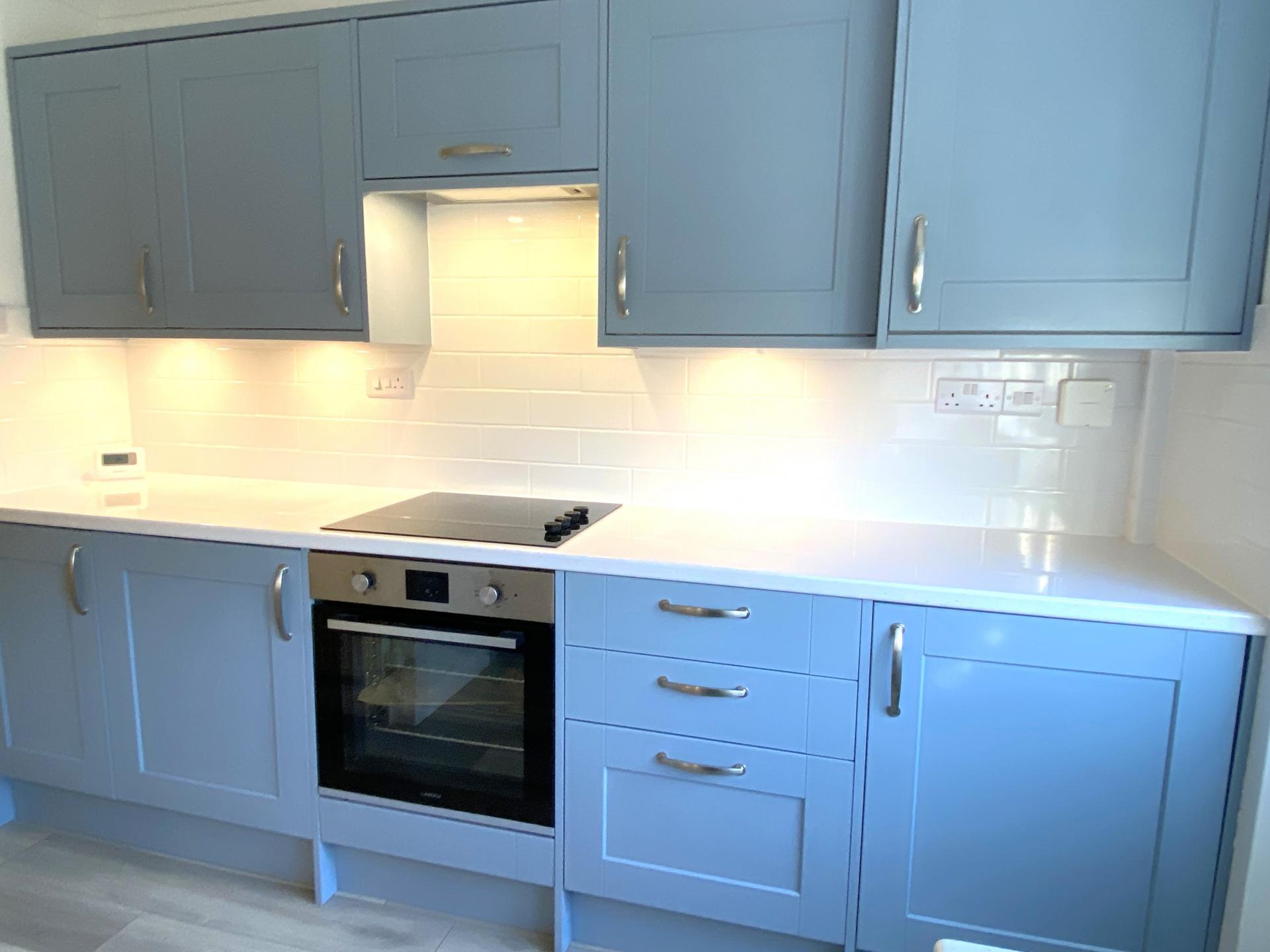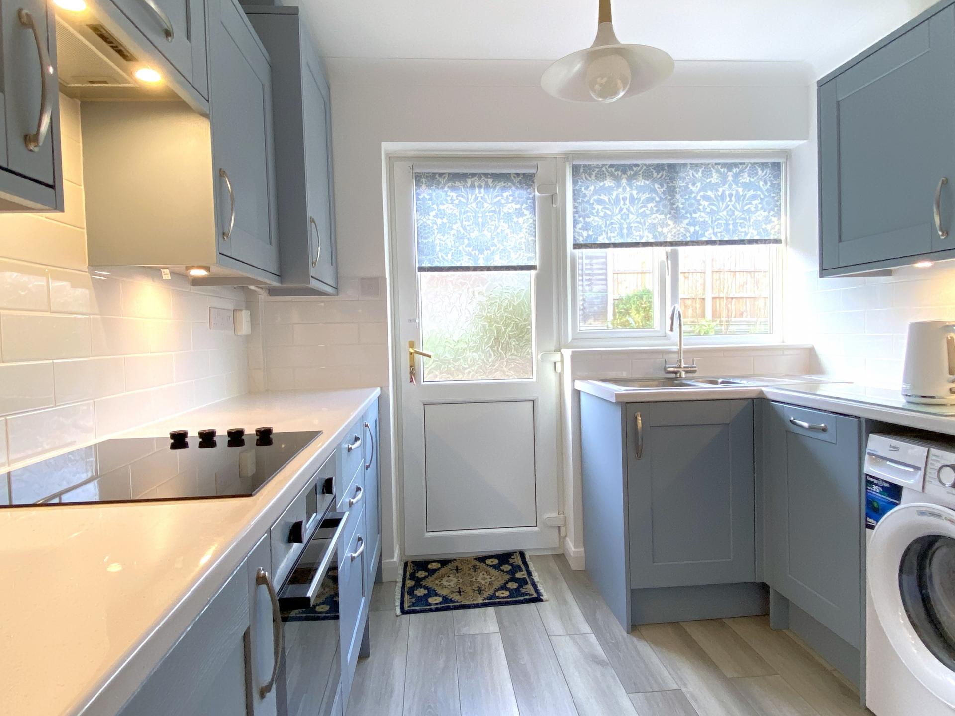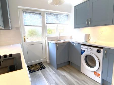 Kitchen 9' 8" x 8' 10" (2.95m x 2.69m) Beautifully fitted with a range of Shaker style base units with working surfaces over, matching wall units, tiled splashback, integrated appliances including electric oven, ceramic hob, extractor over, slimline dishwasher, and fridge, space and plumbing for a washing machine, task lighting, gas boiler providing central heating and domestic hot water, concealed within a unit, one and a halft bowl sink with mixer tap, uPVC double-glazed window and door to rear garden, radiator, laminate flooring.