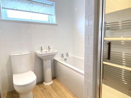 Bathroom 7' 10" x 6' 0" (2.39m x 1.83m) Fitted with a white suite comprising panelled bath with taps, low-level WC, pedestal basin with taps, tiled shower cubicle with pivot door, mixer shower, fully tiled walls, recessed LED spotlights, heated towel rail, front aspect uPVC, double-glazed window with obscure glass.
