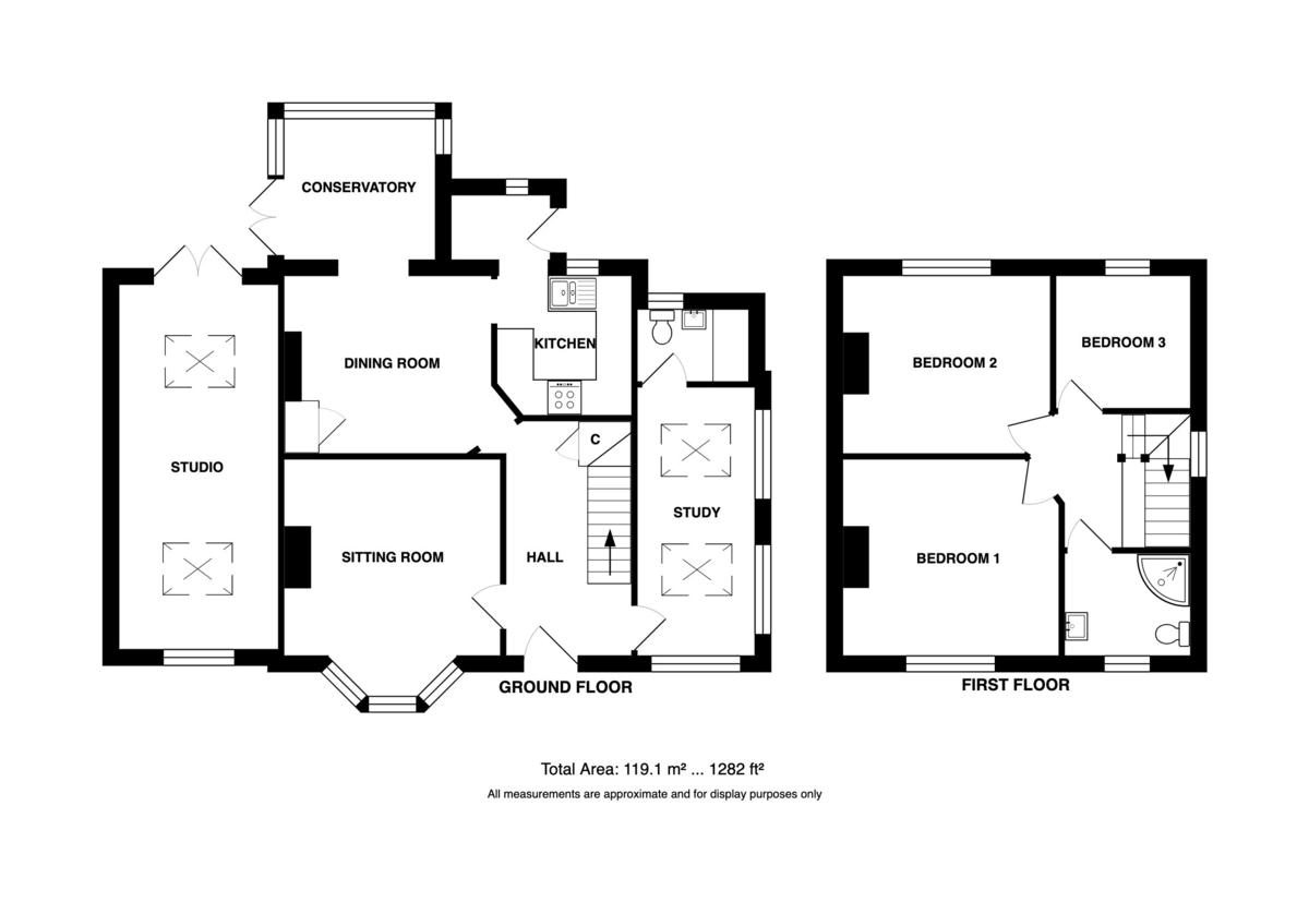 The house offers a superb balance of traditional charm and modern convenience, with light-filled living spaces including a bay-fronted sitting room, a dining room with woodburner, and a versatile study. The kitchen, dining room and connect seamlessly with the mature, secluded garden, while a large separate studio provides the perfect space for creative pursuits or a home office.