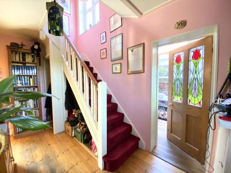 Reception Hall 13' 3" x 4' 5" (4.04m x 1.35m) Stripped boarded floor, carpeted stairs to the first floor with pine bannister, stripped pine doors with leaded lights in Art Deco style, open under stairs storage area.