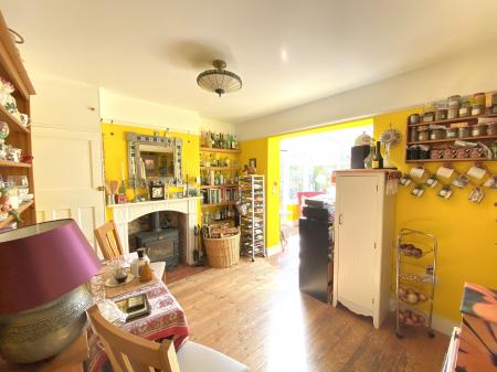 Dining Room 10' x 11' 7" (3.05m x 3.53m) Woodburner recessed to chimney breast with tiled hearth and mantel surround, built-in storage cupboard, picture rail, radiator, open to conservatory, open plan to: