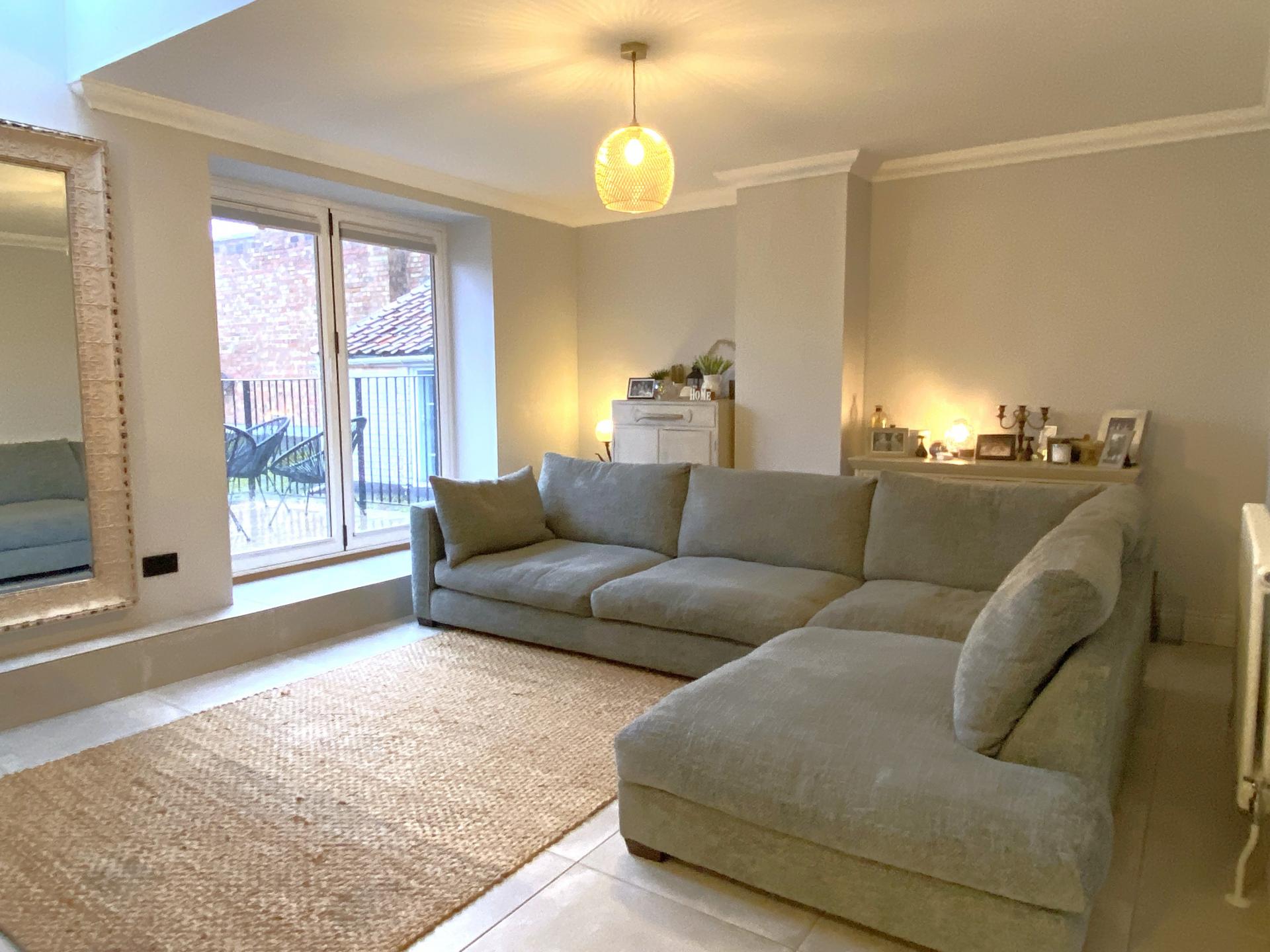 - Contemporary open plan living space with bifold doors to balcony