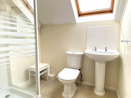 Bathroom 6' 5" reducing to 5'6" x 6' 7" (1.96m x 2.01m) Fitted with a white suite comprising pedestal basin with taps, low level WC, shower cubicle with electric shower over, sloping ceiling, Velux rooflight, Dimplex wall mounted fan heater, part tiled walls and tiled floor.