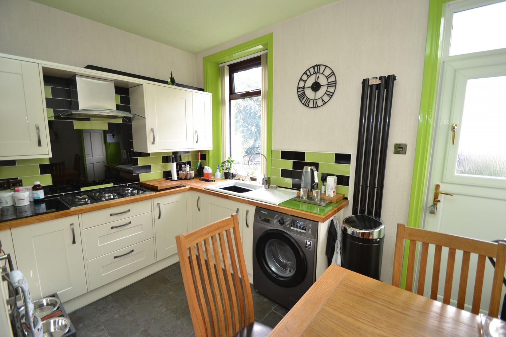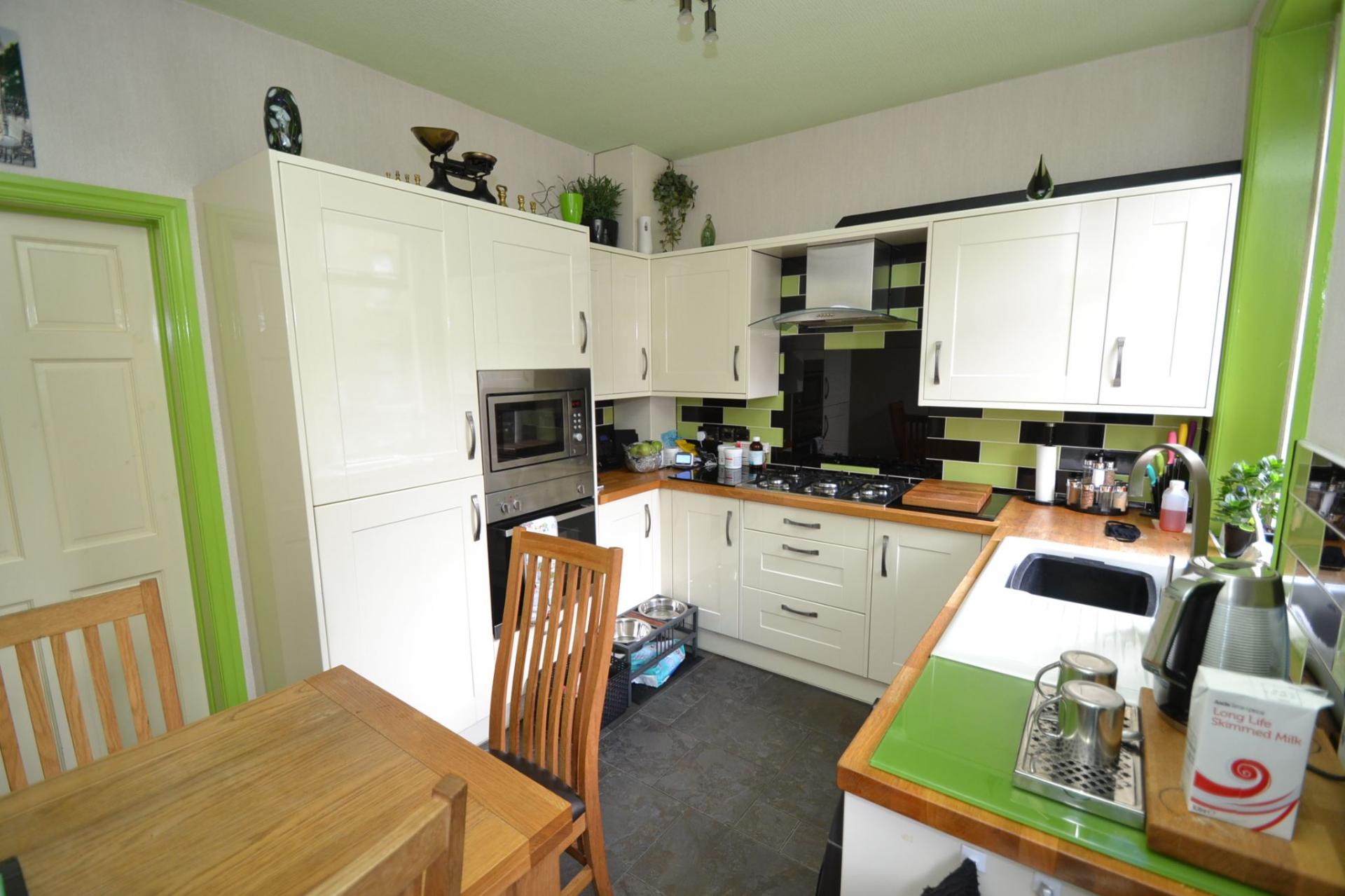 Kitchen: 3.29m x 2.80m (10'7 x 9'1). Excellent range of wall & base units in cream, solid butcher wood work tops with attractive contrasting brick effect tiling above, stainless steel extractor over a 5 ring gas Viceroy stainless steel hob, built in microwave and oven in stainless steel, integrated tall boy fridge and freezer, tiled floor, upright contemporary radiator, sink in white with a chrome mixer tap, wood grain Upvc dg window and part stable door to rear, space for a small breakfast table and chairs.