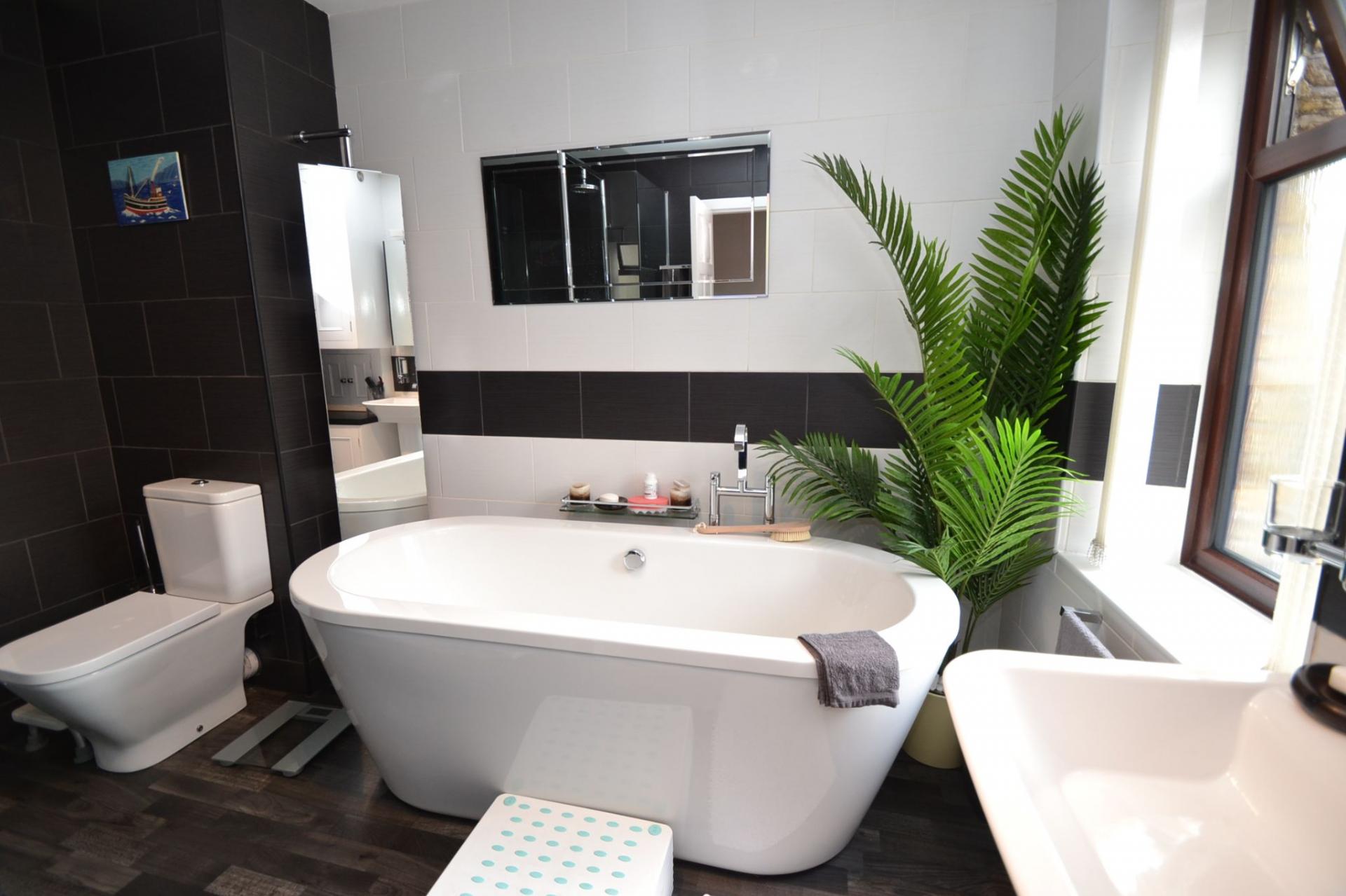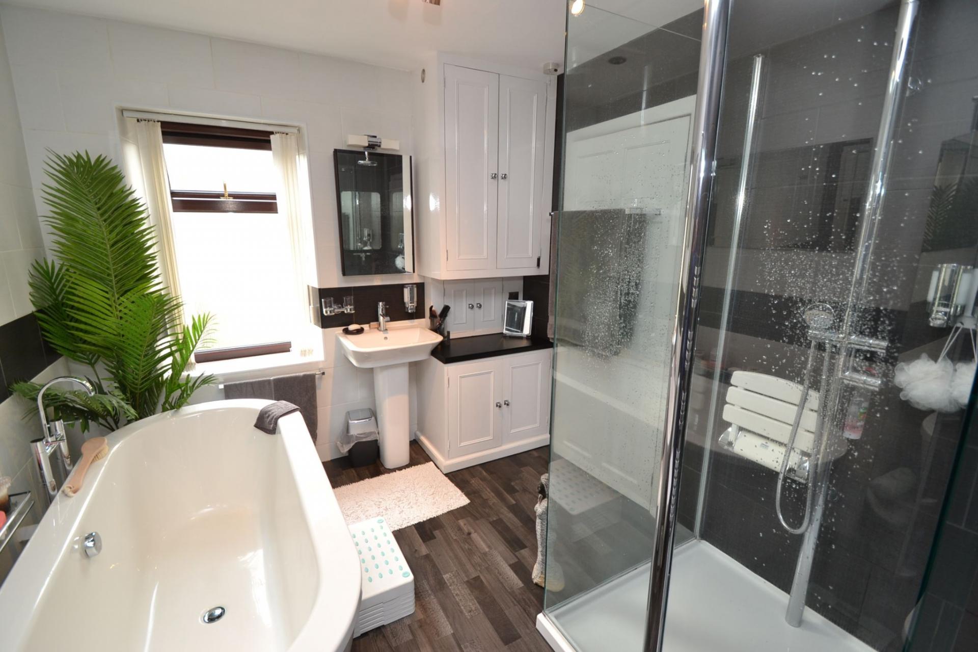 Bathroom: Superb fitted suite in white with a free standing bath, wash basin and wc in white, walk in large glass shower cubicle with a chrome thermostatically controlled shower unit, inset ceiling lights, vanity cupboards and a cupboard houses the Main 24HE Combi-boiler, heated chrome towel rail, frosted Upvc dg window.