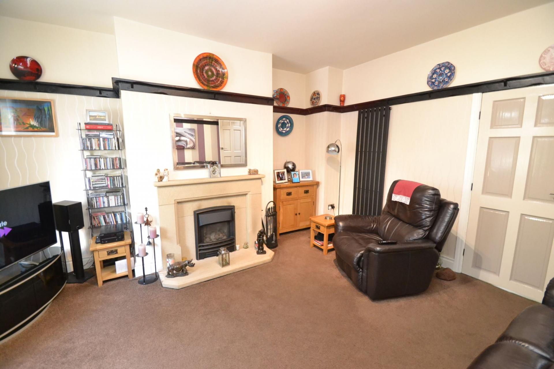 Lounge: 4.68m x 4.19m (15'3 x 13'7). Wood grain Upvc dg window to front, delft rack, stone fireplace feature with an inset living flame coal effect gas fire, upright contemporary radiator.