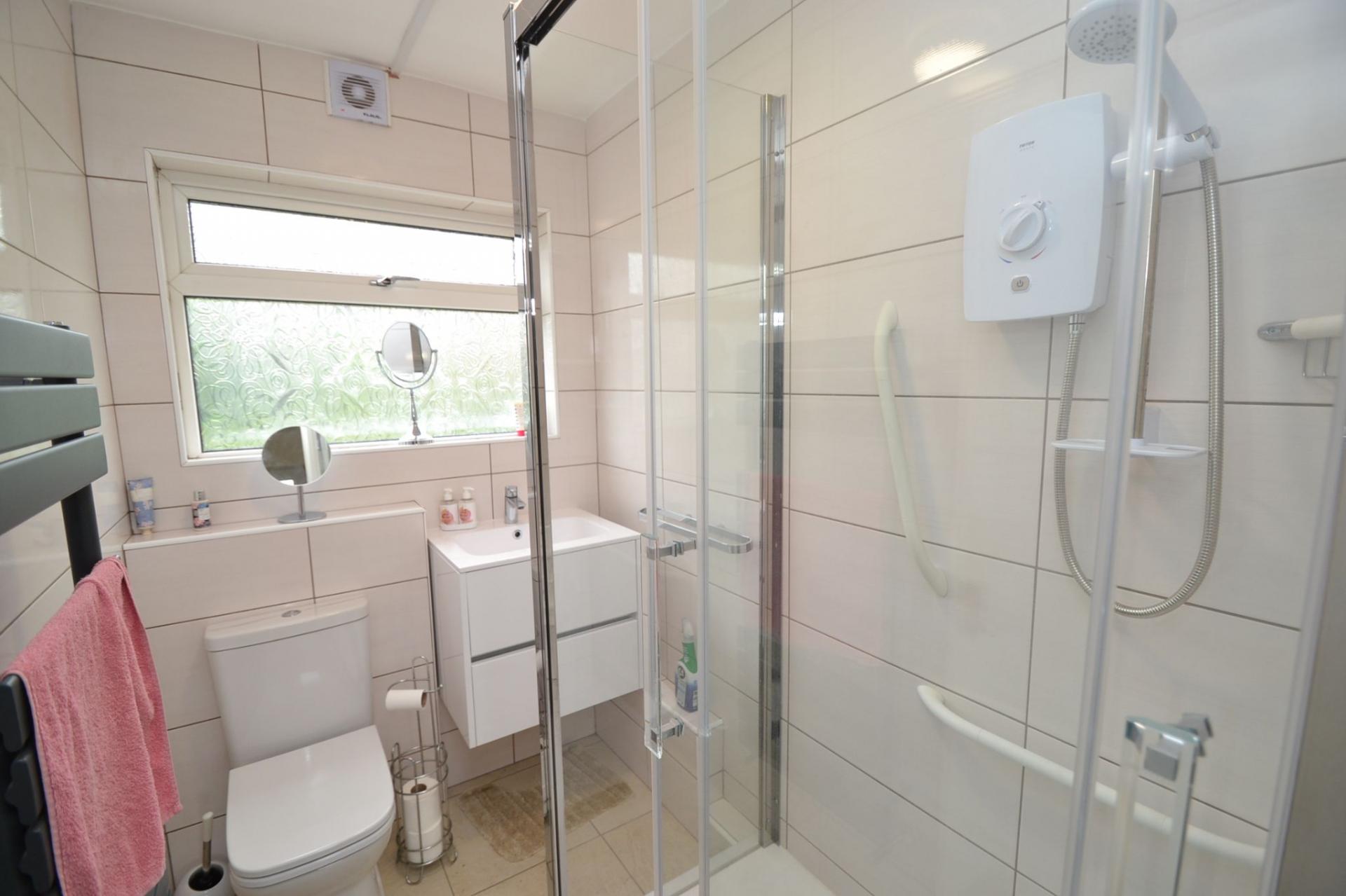 Shower Room: 2.19m x 1.46m (7'2 x 4'9). Large shower cubicle with slide back doors and a Triton electric shower, tiled floor, wash basin set on a high gloss vanity unit, contemporary up right radiator, frosted Upvc dg window, extractor.