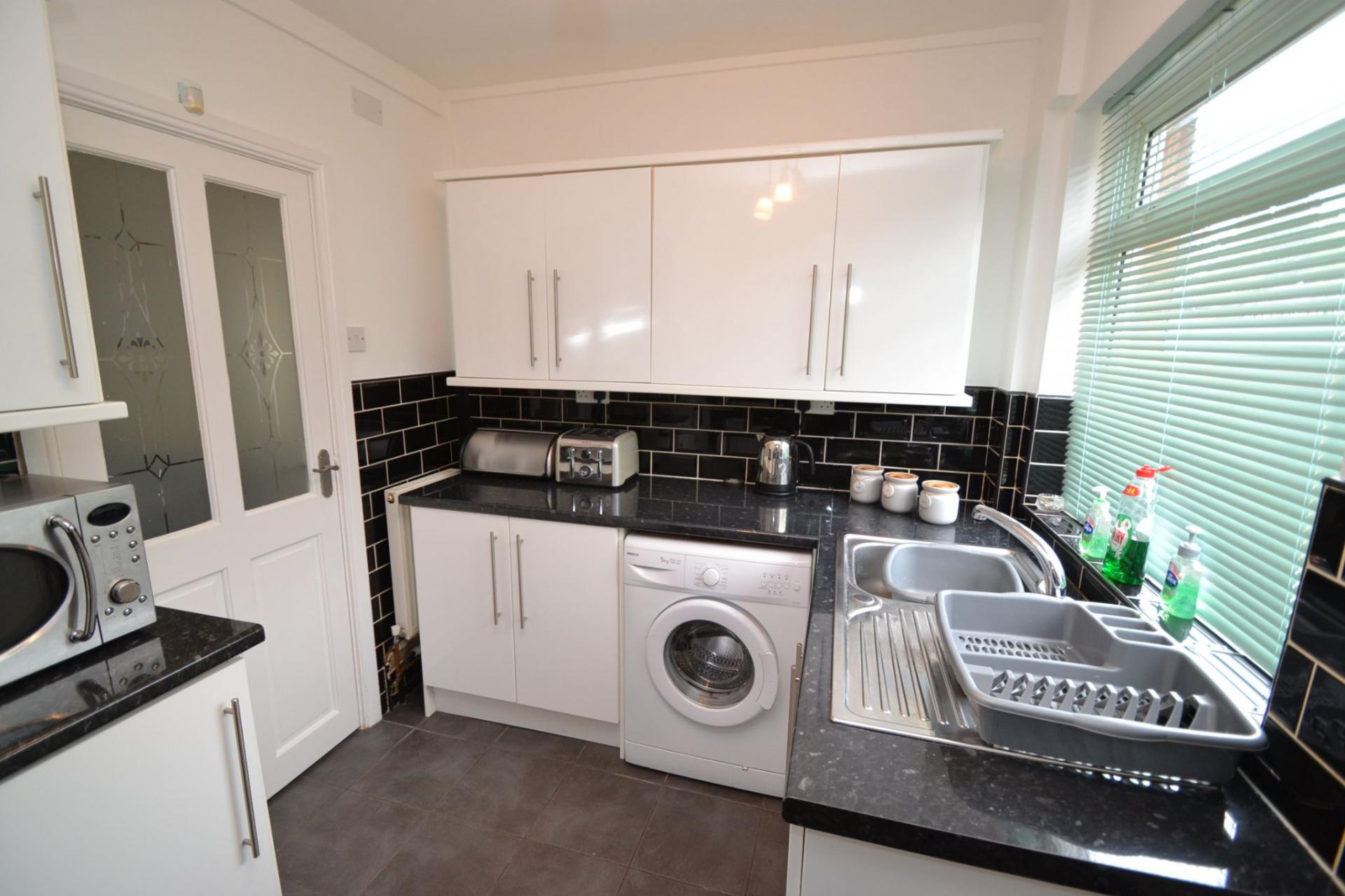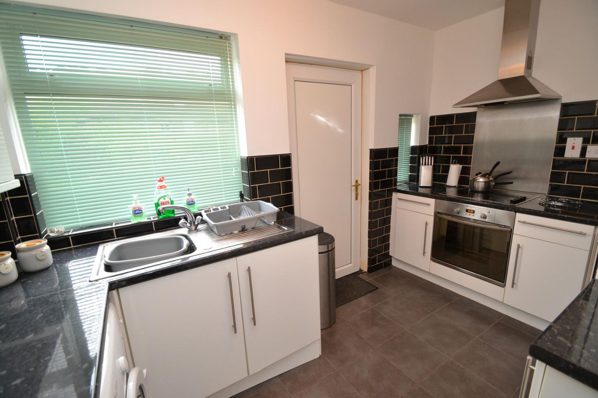Kitchen: 3.67m x 2.25m (12'0 x 7'4). Range of wall & base units in high gloss white with granite effect work tops and black brick effect tiling above, stainless steel sink with a mixer tap, plumbed for an auto-washer, integrated fridge freezer, stainless steel extractor hood and a stainless steel splash back over a 4 ring Hotpoint ceramic electric hob, built in electric oven by Hotpoint, two Upvc dg windows to rear along with a rear Upvc door, radiator, ceramic tiled floor.