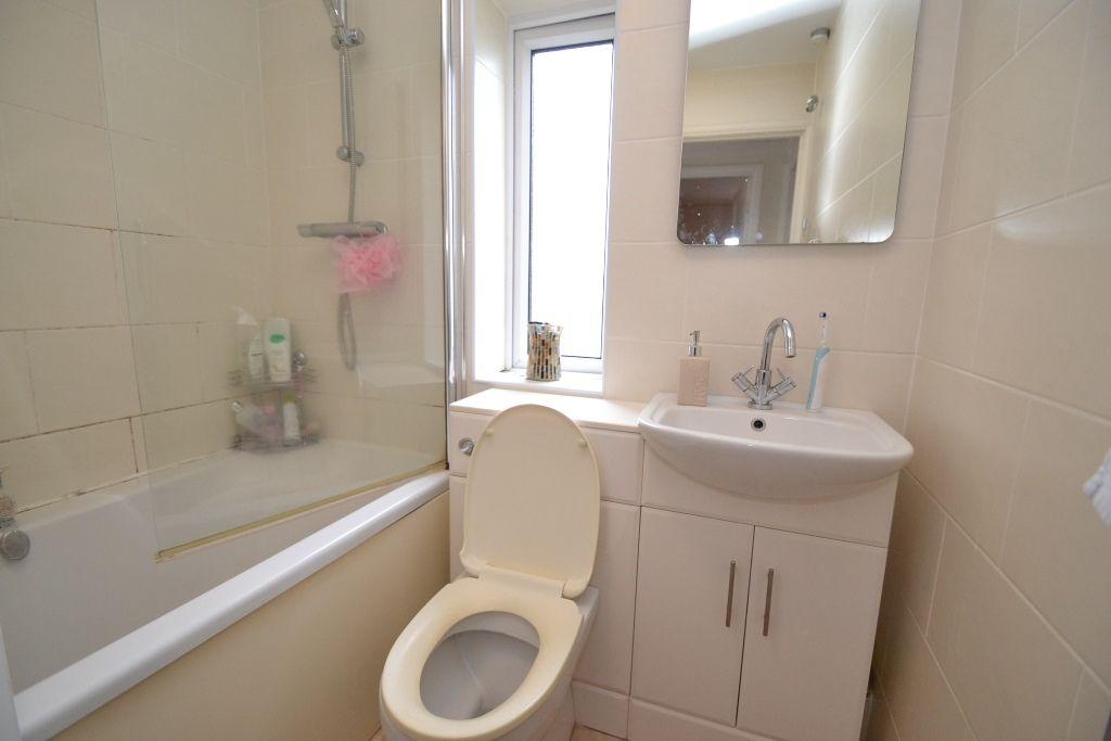 Bathroom: 1.93m x 1.82m (6'3 x 5'11). Three piece suite in white, fully tiled, chrome thermostatically controlled shower unit, shower glass screen, frosted Upvc dg window to rear, wash basin and wc in an enclosed vanity unit, heated chrome towel rail.
