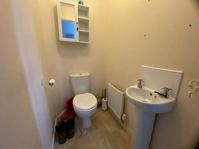 Cloakroom: Low flush WC, hand basin and radiator.