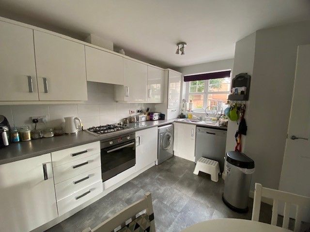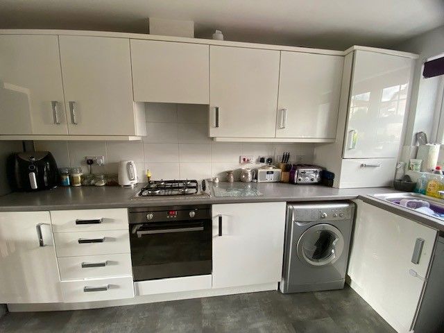 Dining Kitchen: 13'6'' x 11'6'' (4.11m x 3.51m). Range of modern white high gloss fitted kitchen units, work tops with tiling above, incorporating a stainless steel sink unit, stainless steel electric oven, 4 ring gas hob, plumbed for an auto washer and dishwasher, radiator, space for a table and chairs, frosted Upvc dg window to front.