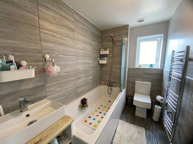 Bathroom: Superbly presented modern three piece suite in white, comprising chrome shower mixer tap, screen over the bath, heated chrome towel rail, part tiled wall, radiator, frosted Upvc dg window.