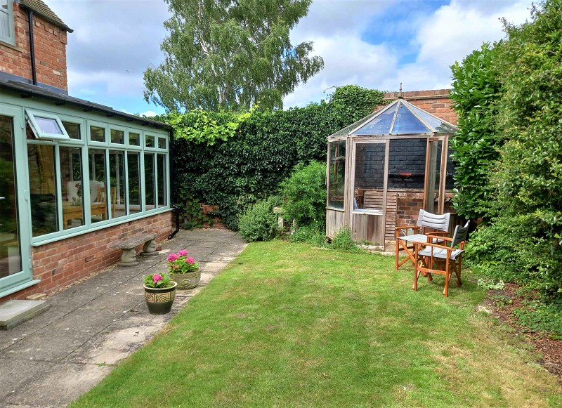 Approximately 25 ft deep x 70ft wide. Mainly lawned area with timber frame green house. Flagged patio, large timber cabin to the eastern side and pathway with gated access leading to front garden.