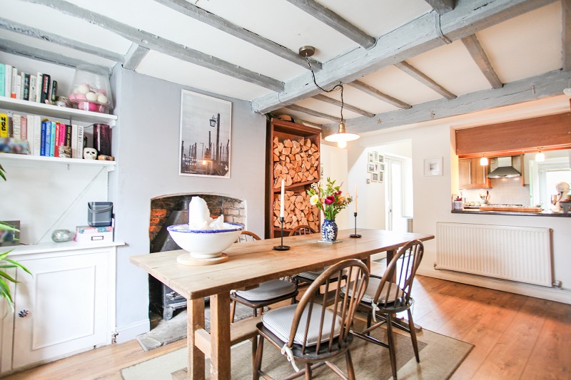 With oak laminate flooring throughout, villager cast iron wood burning stove set into original chimney breast, built in double cupboard to one side of chimney breast housing gas meter, painted beams to the ceiling, easy staircase returning to first floor with batten balustrade and hard wood front door. Double radiator, built in under stairs storage cupboard, built in window seat into bay window with storage beneath. Room formed in part open plan with kitchen.