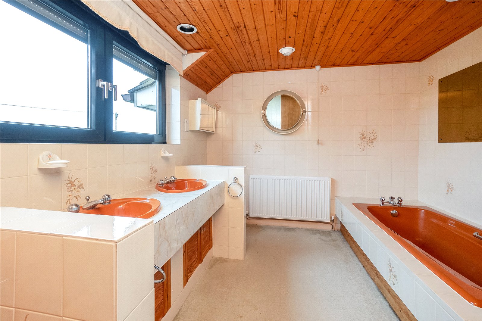 Comprising of Coloured Suite of Panelled Bath, Twin Hand Wash Basins set with Vanity Cupboards Below, Low Level WC and Bidet. Double Glazed Tilt and Turn Windows to Front Aspect with Views over the Allotments and Countryside Beyond. Part Tiled Walls.