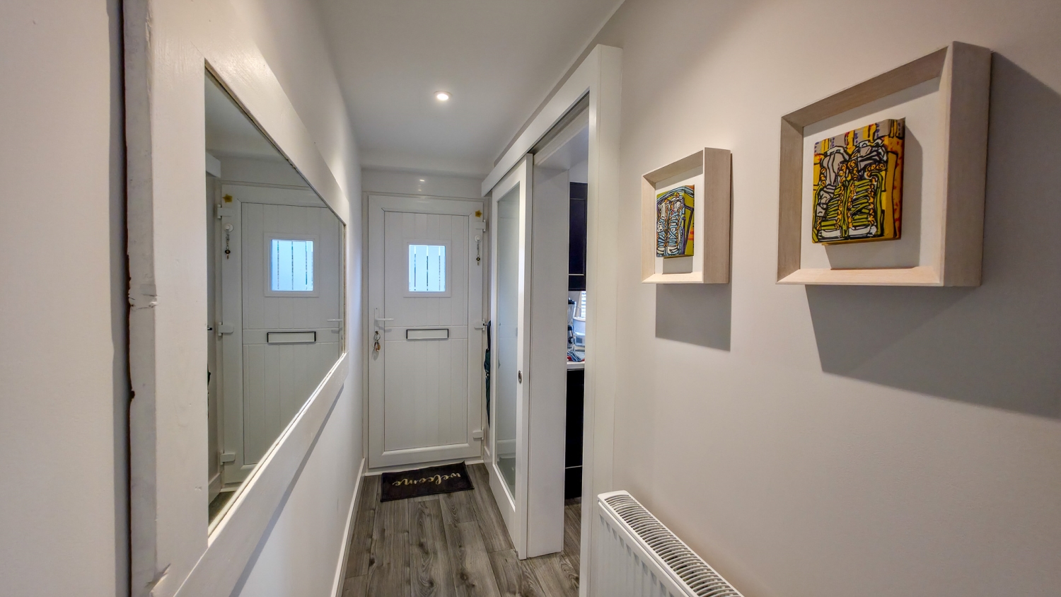 The accommodation comprises a welcoming entrance hall, a bright and spacious living room with doors opening onto the front garden, and a modern fitted kitchen featuring contemporary units and worktops. There are two well-proportioned bedrooms, with the principal bedroom enjoying direct access to the private rear garden, offering a peaceful retreat or entertaining space. The stylish newly fitted bathroom has been finished to a high standard with sleek fixtures and fittings.