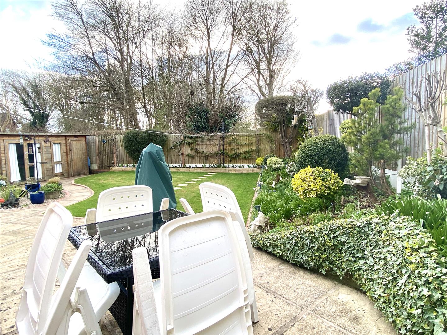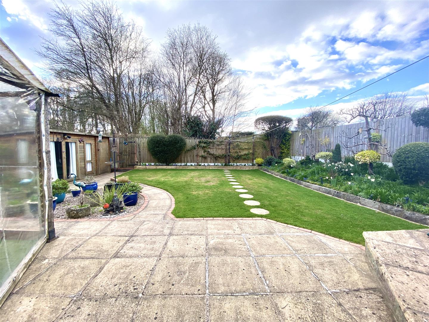 There is a particularly attractive and good sized landscaped west facing REAR GARDEN which is neatly kept and laid to lawn with attractive raised beds, gravelled area with patio and a further secluded patio and terrace enclosed by a well maintained wall with raised shrubbery displays. The garden is well enclosed with a coppice of trees to the rear boundary, affording the garden considerable privacy.