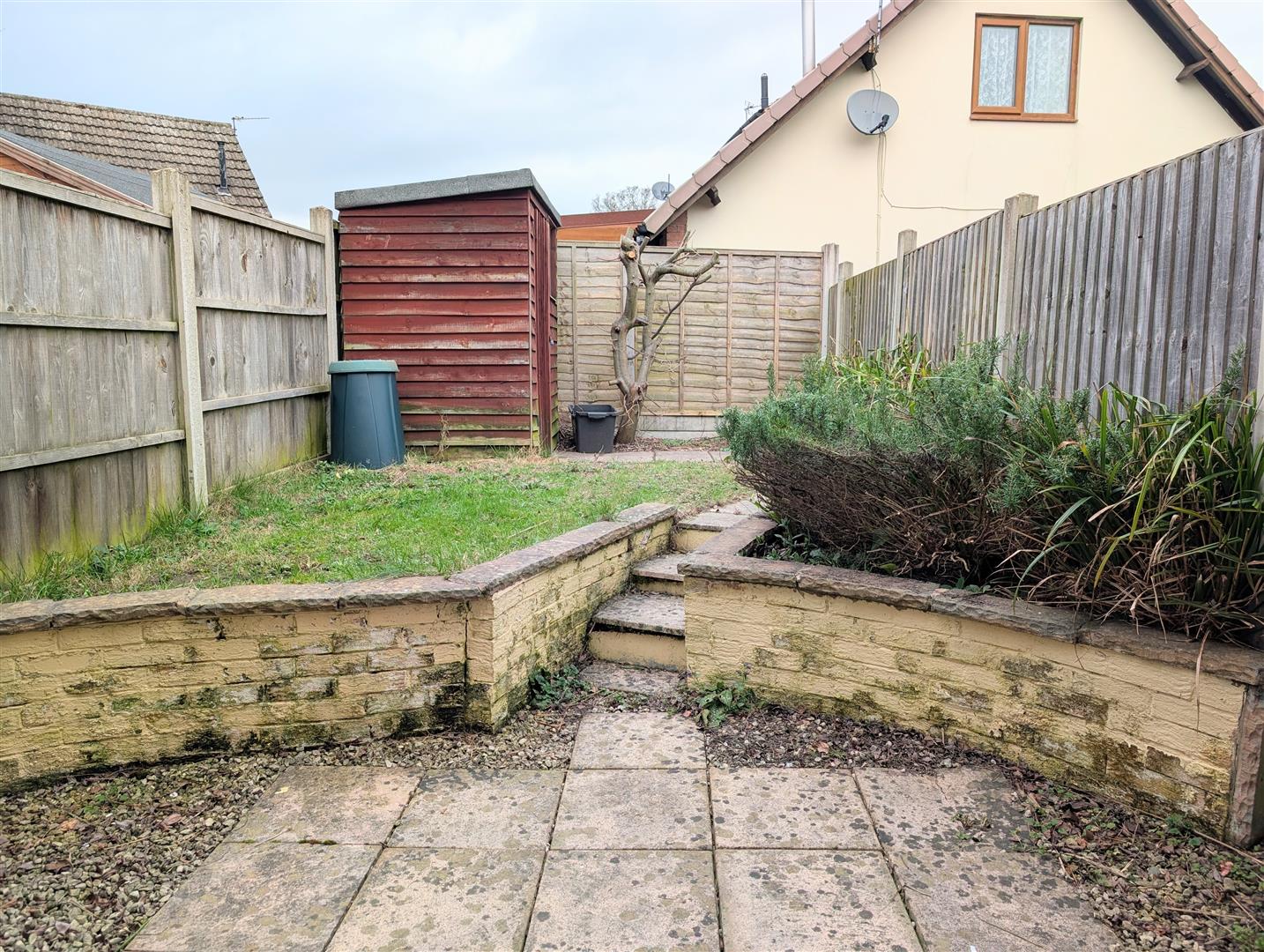 Enclosed REAR GARDEN with paved patio area and dwarf brick wall with steps leading to a lawned area.