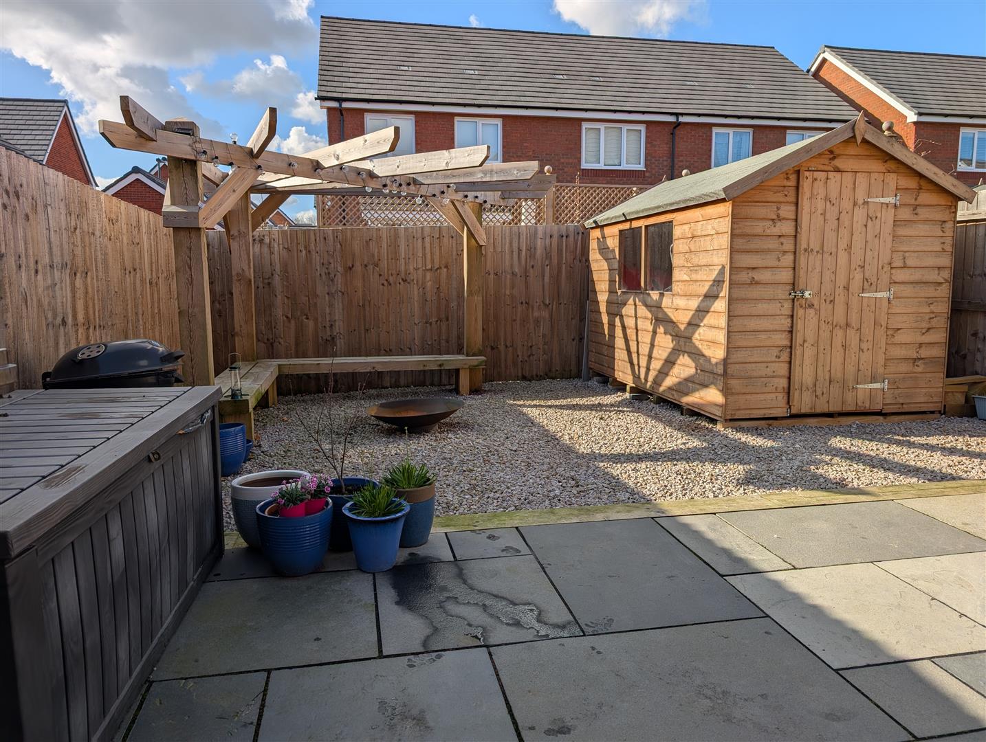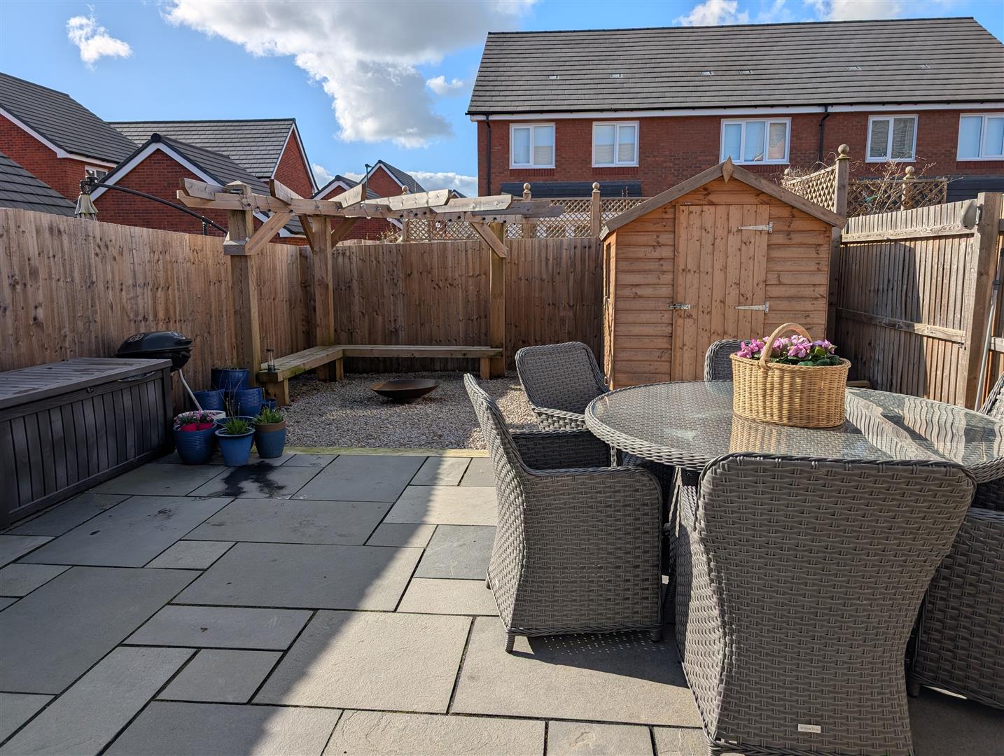- Rear garden with paved patio and terrace.